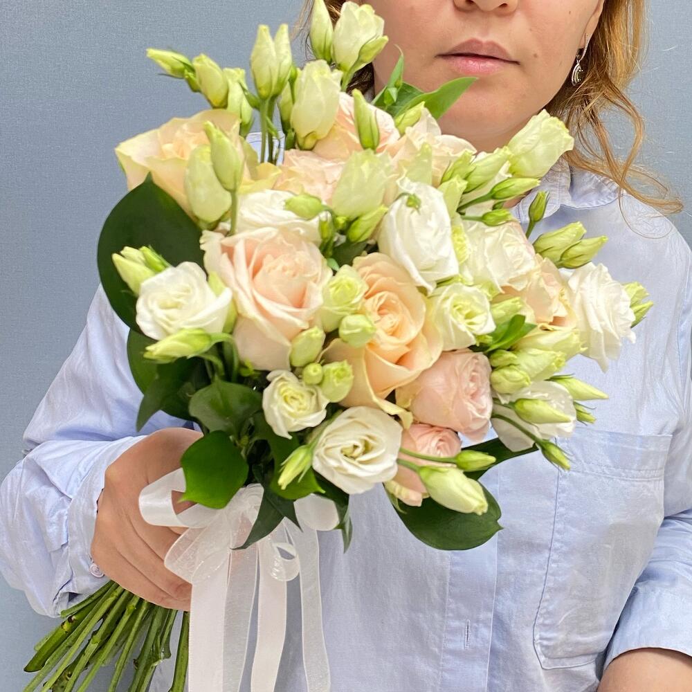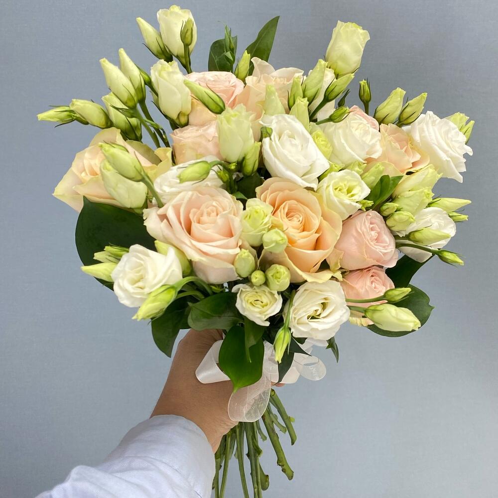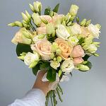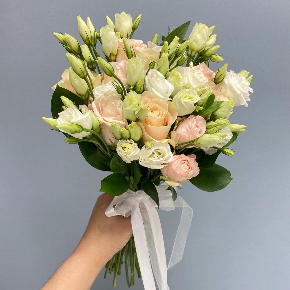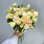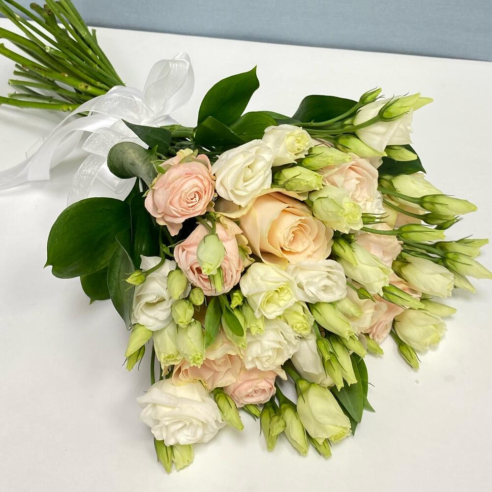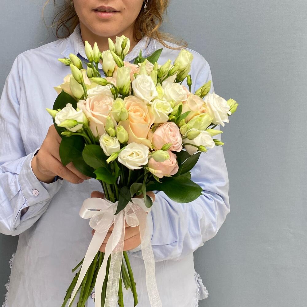 Роза - 5 шт. Зелень - 1 шт. Эустома - 3 шт. Лента атласная - 1 шт. кустовые розы - 3 шт.