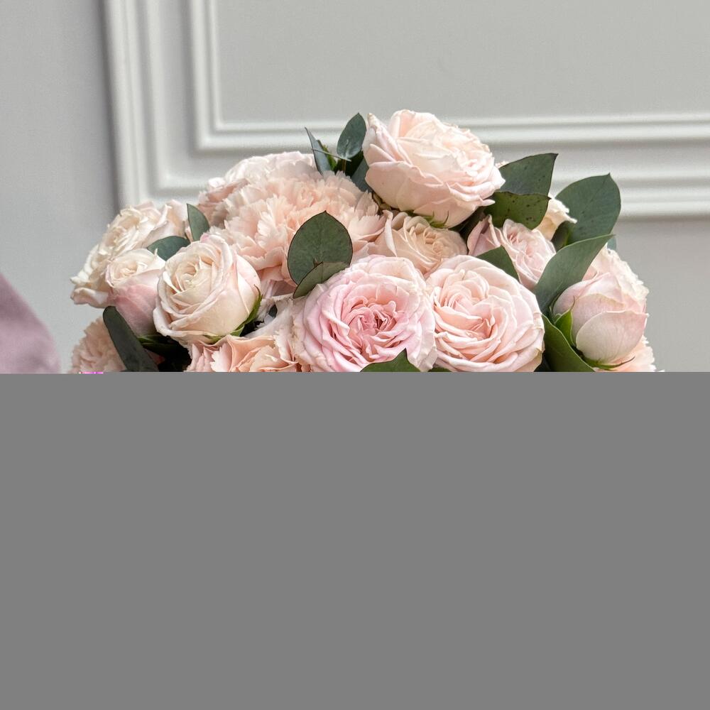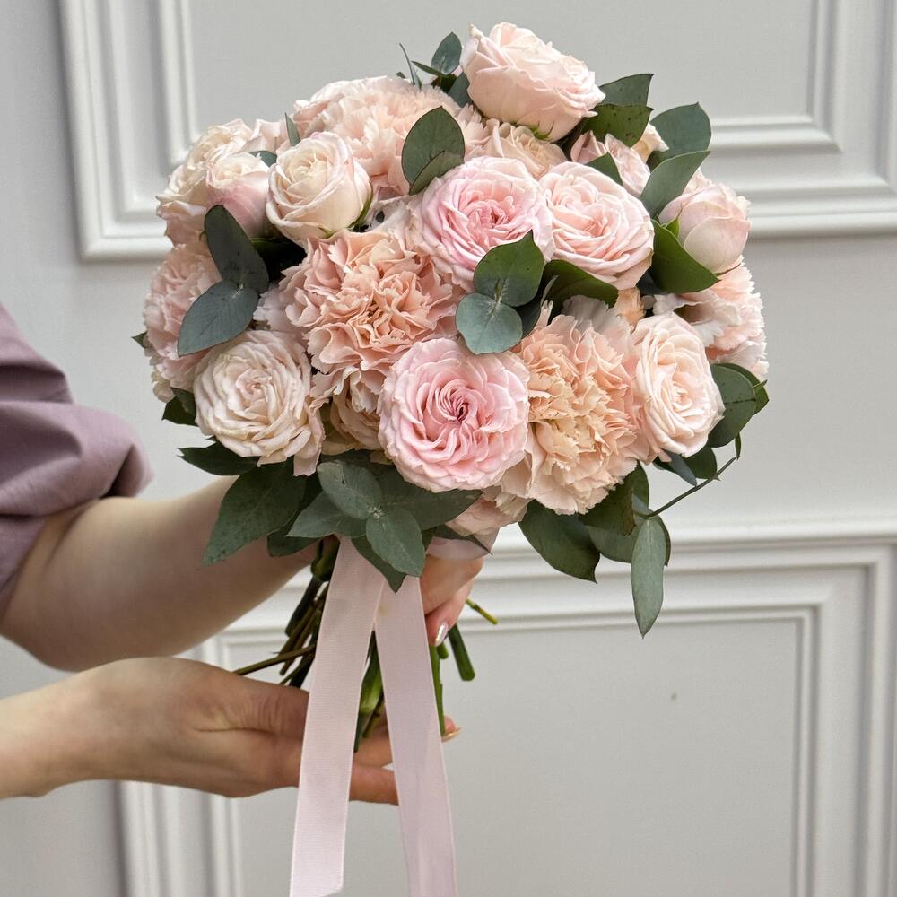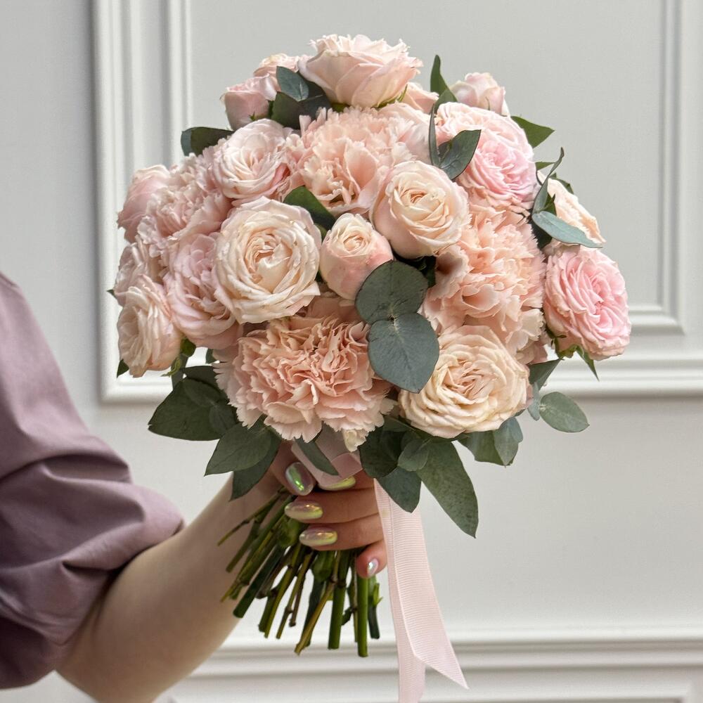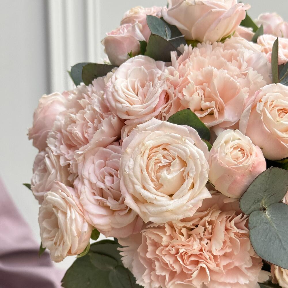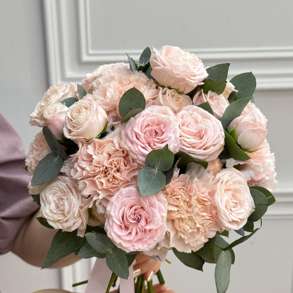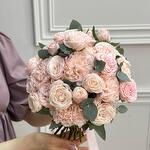 Эвкалипт - 2 шт. Гвоздика - 7 шт. Роза кустовая пионовидная - 9 шт.