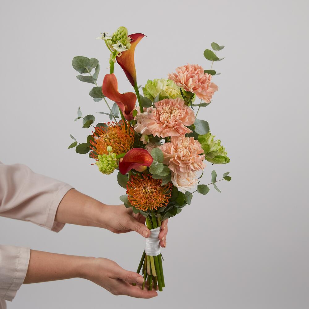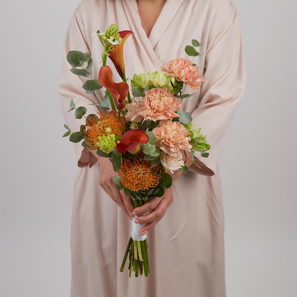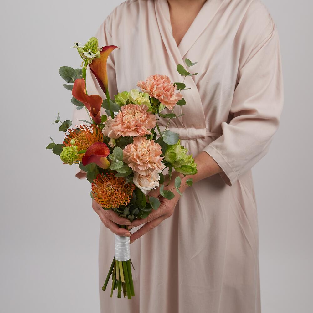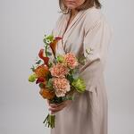 Роскошный букет невесты с оранжевыми каллами: воплощение элегантности и страсти Создайте неповторимый образ в день свадьбы с изысканным букетом, где оранжевые каллы становятся главным акцентом композиции, гармонично сочетаясь с нежными цветами. Этот букет — истинное воплощение романтической элегантности и страстного характера. Роза Вегги придаёт композиции утончённость и благородство, а кустовые розы сорта Бомбастик добавляют пышность и объём. Оранжевые розы создают яркие акценты, перекликаясь с каллами, а карамельные гвоздики вносят нежные пастельные оттенки. Орнитогалум и нутан привносят воздушность и лёгкость, а эвкалипт создаёт свежий акцент. Идеально подходит для: Свадеб в тёплых тонах Осенних торжеств Романтических церемоний Тематических свадеб Классических торжеств Этот букет станет истинным украшением вашего свадебного образа, подчеркнёт индивидуальность и создаст незабываемые моменты в самый важный день вашей жизни. Сочетание оранжевых акцентов с нежными оттенками создаст гармоничную композицию, которая будет радовать вас и ваших гостей. Доверьте создание вашего свадебного букета профессионалам, и он станет настоящим произведением искусства, запечатлённым на фотографиях на долгие годы.