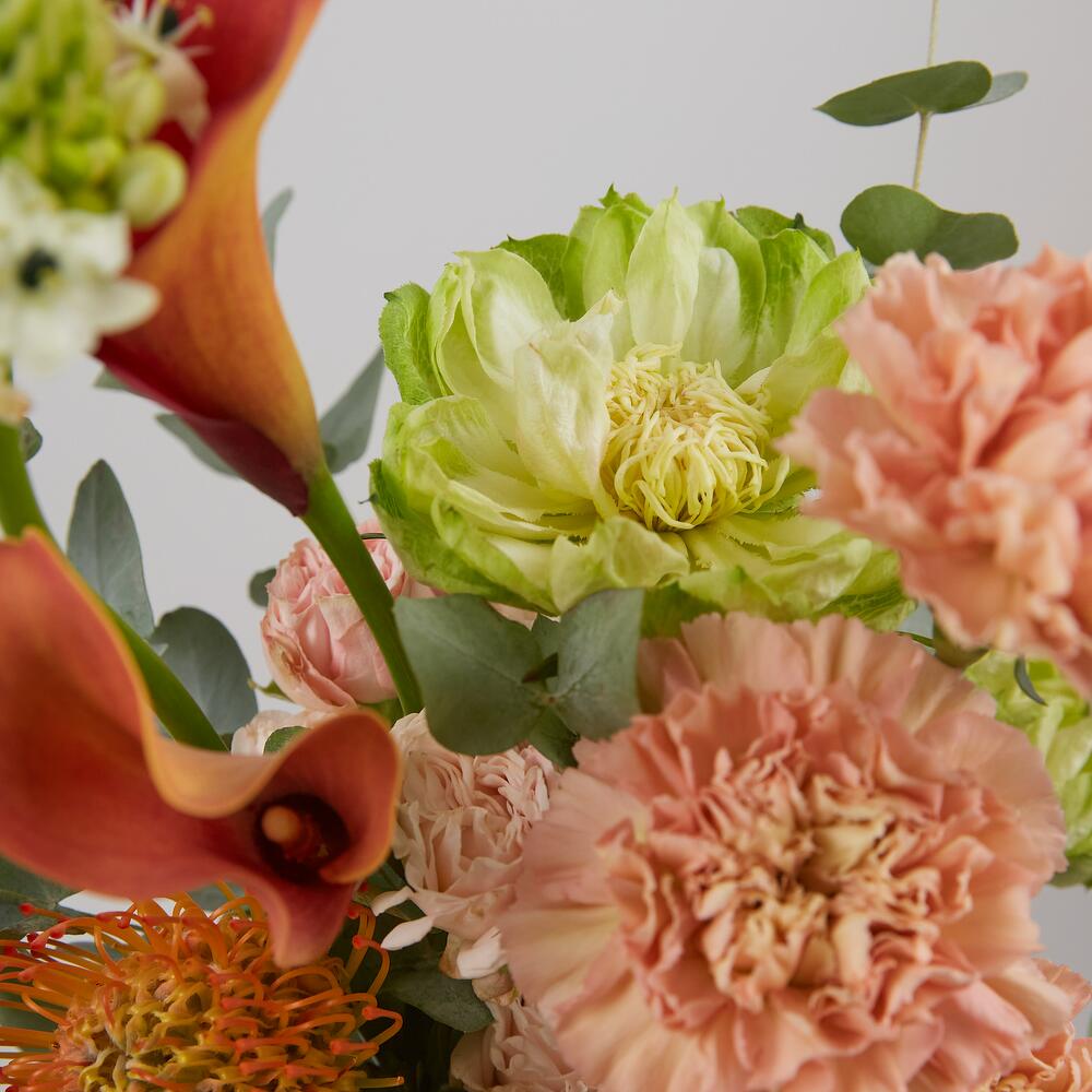 Калла - 3 шт. Эвкалипт - 5 шт. Гвоздика - 3 шт. Лента атласная - 1 шт. Орнитогалум - 2 шт. Нутан - 2 шт. Роза кустовая пионовидная - 2 шт. роза вегги - 2 шт.