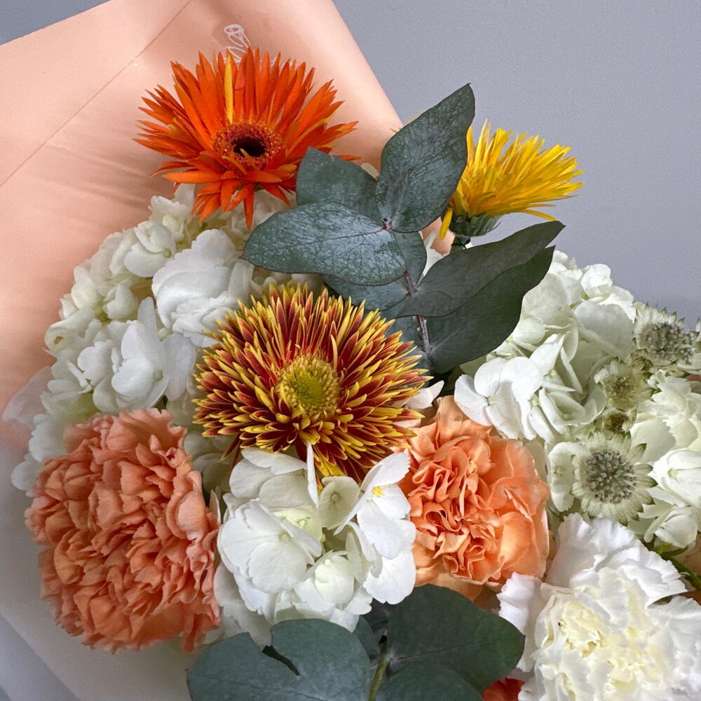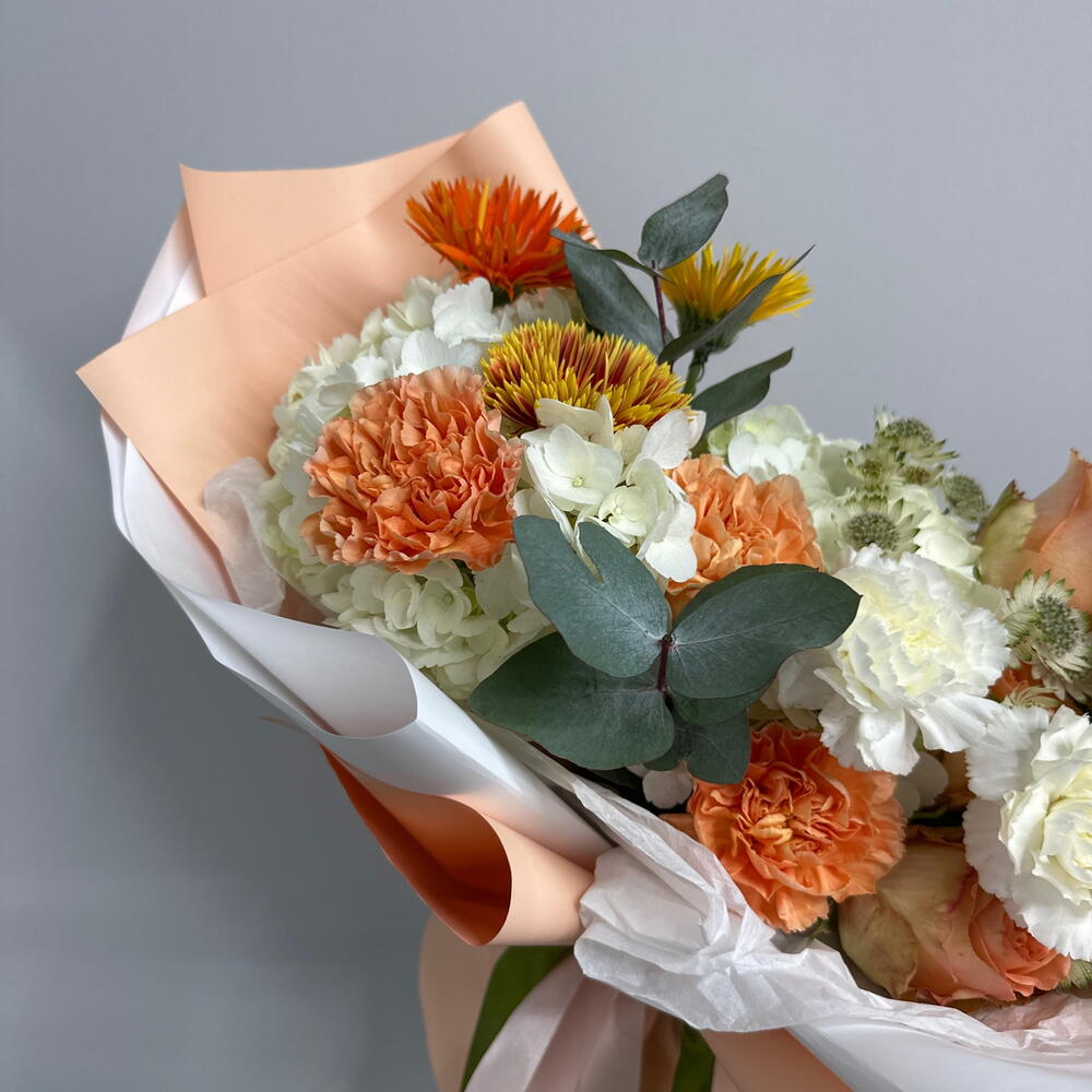 Гортензия - 2 шт. Гвоздика - 5 шт. Гербера - 3 шт. Астранция - 2 шт. Эвкалипт Цинерея - 1 шт. Дизайнерская упаковка - 1 шт. кантри хоум роза - 5 шт.