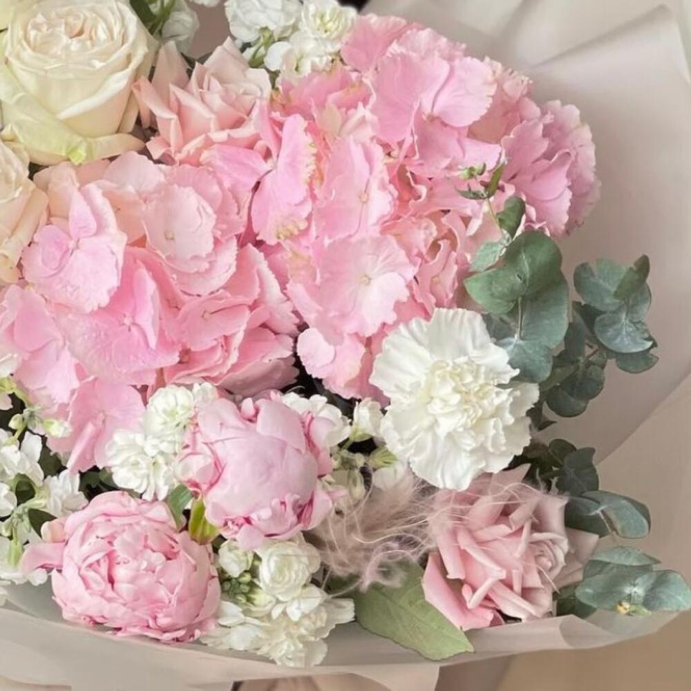 Пион - 3 шт. Эвкалипт - 3 шт. Роза - 5 шт. Упаковка - 1 шт. Диантус - 3 шт. Гортензия розовая - 2 шт. Маттиола Белая - 5 шт. роза white o'hara(ароматная) - 3 шт.