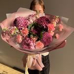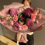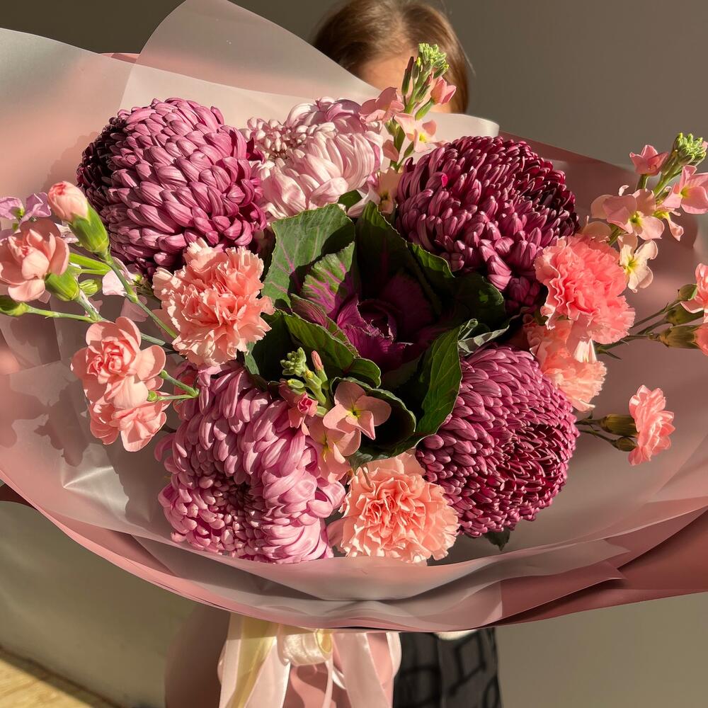 Маттиола - 3 шт. Диантус - 5 шт. Брассика - 1 шт. Упаковка дизайнерская - 1 шт. хризантема бигуди - 5 шт.