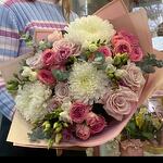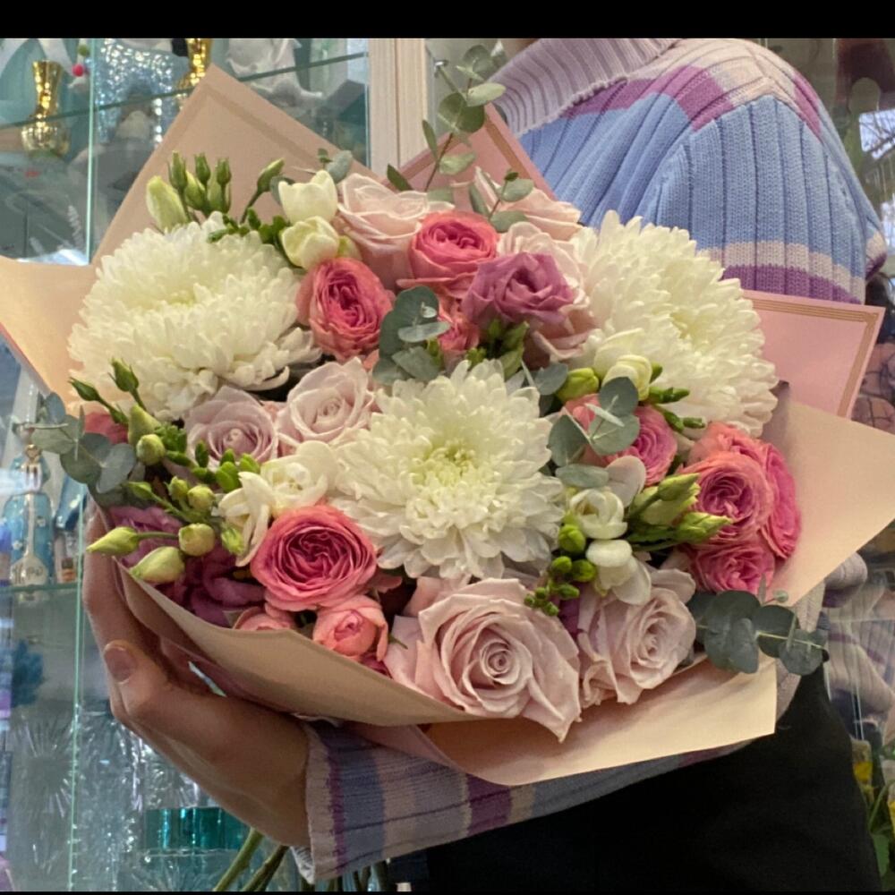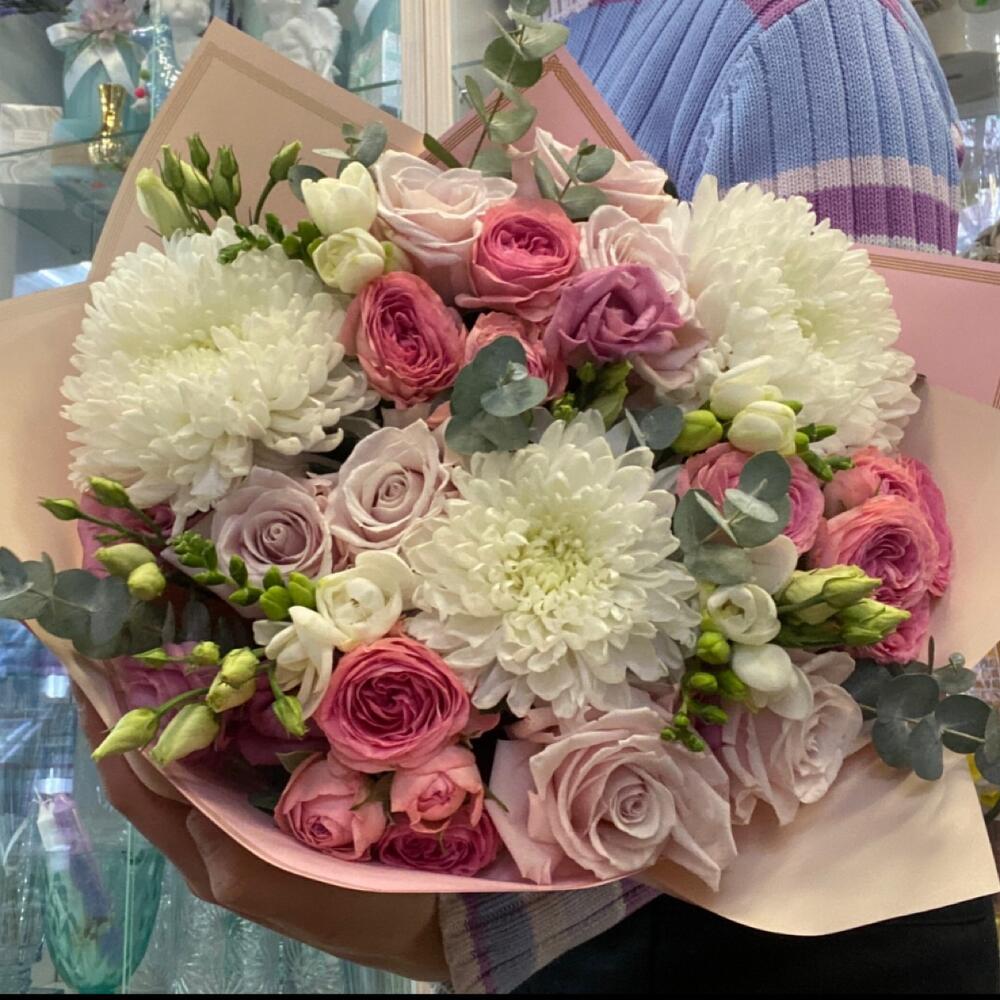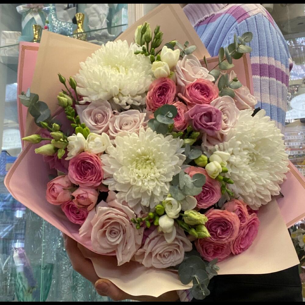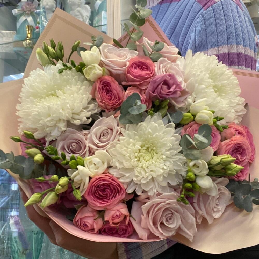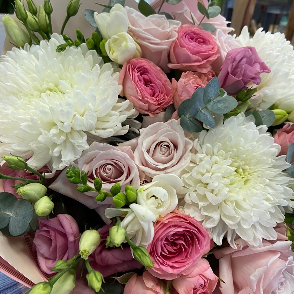Лизиантус - 2 шт. Роза кустовая - 2 шт. Роза Эквадор - 4 шт. Лента атласная - 2 шт. Упаковка дизайнерская - 4 шт. хризантем одноголовая - 3 шт. зернь декоративная - 3 шт.
