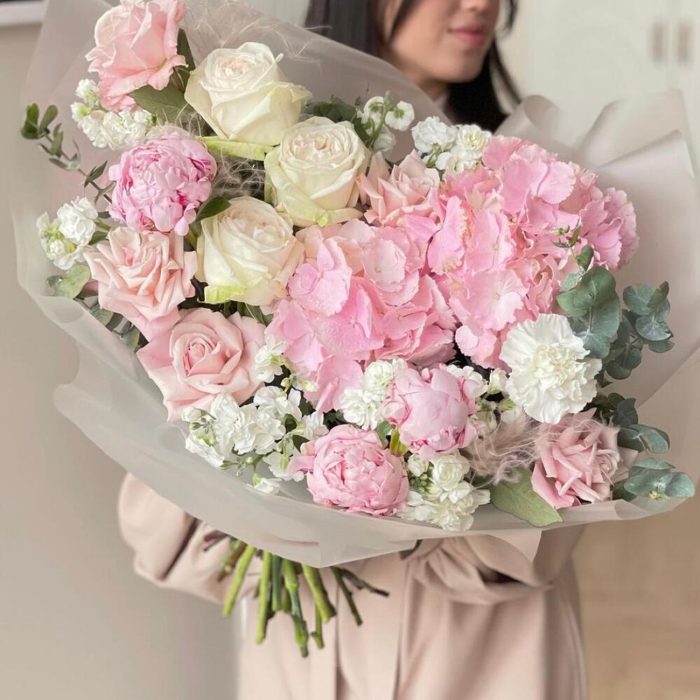 Пион - 3 шт. Эвкалипт - 3 шт. Роза - 5 шт. Упаковка - 1 шт. Диантус - 3 шт. Гортензия розовая - 2 шт. Маттиола Белая - 5 шт. роза white o'hara(ароматная) - 3 шт.