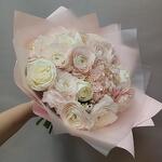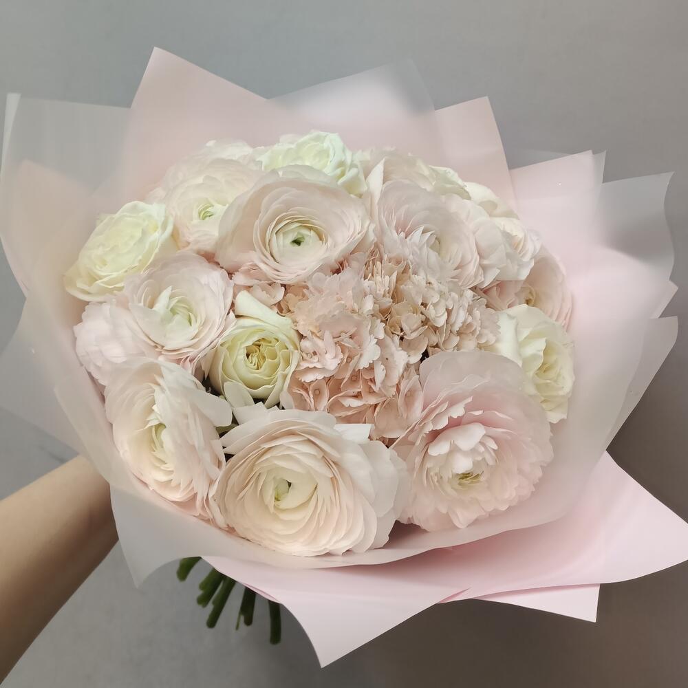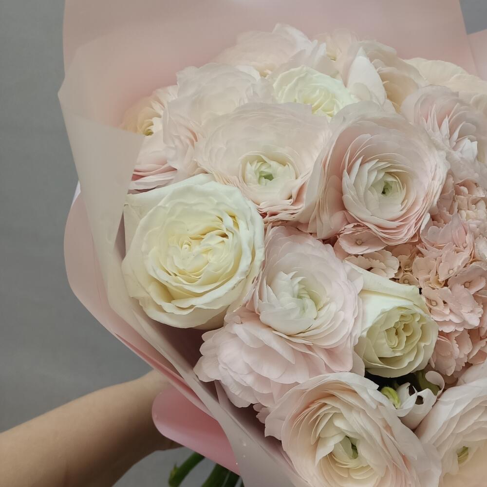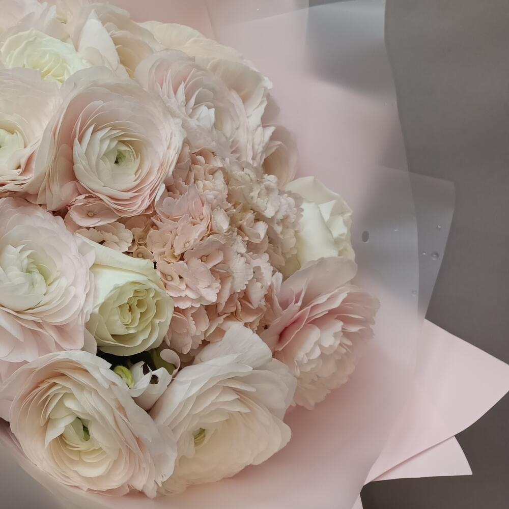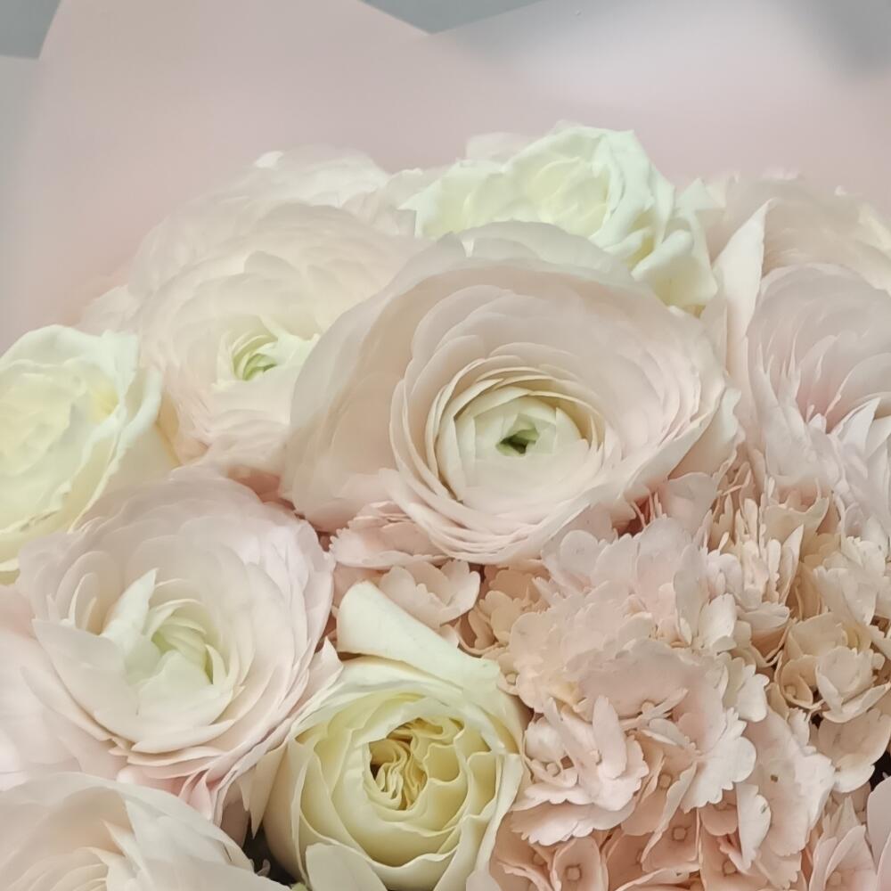 Гортензия - 1 шт. Роза - 5 шт. Лента атласная - 2 шт. Ранункулюс - 11 шт. Упаковка дизайнерская - 2 шт.
