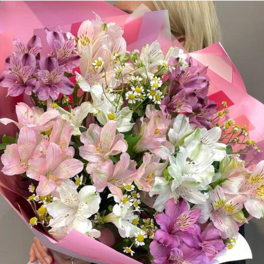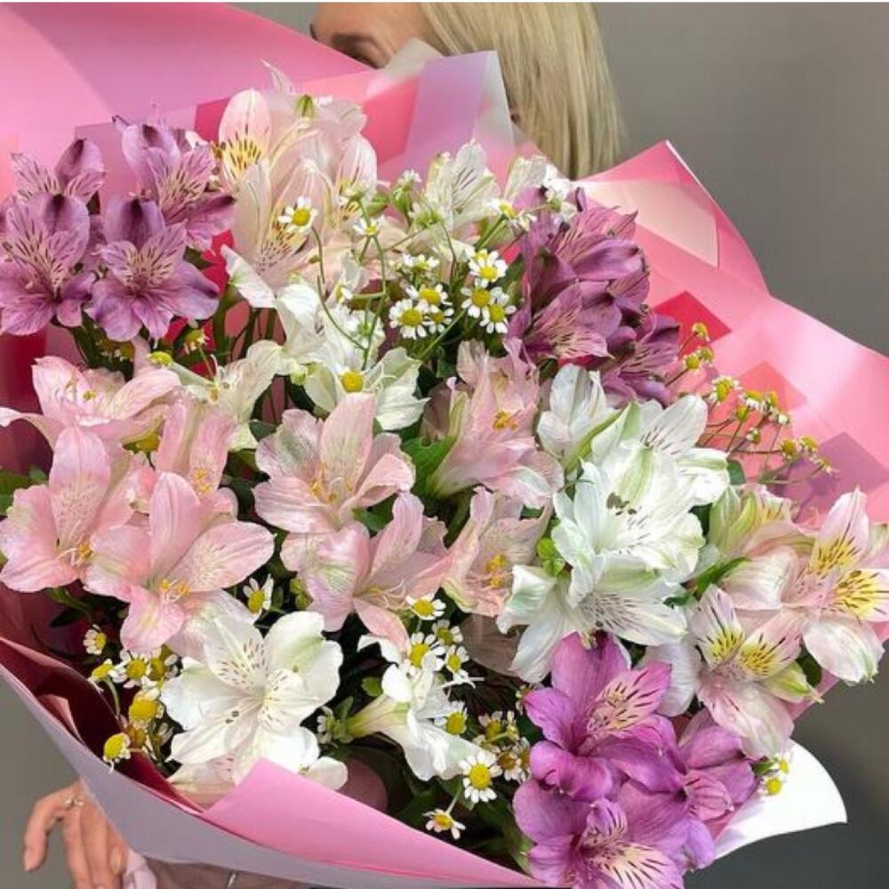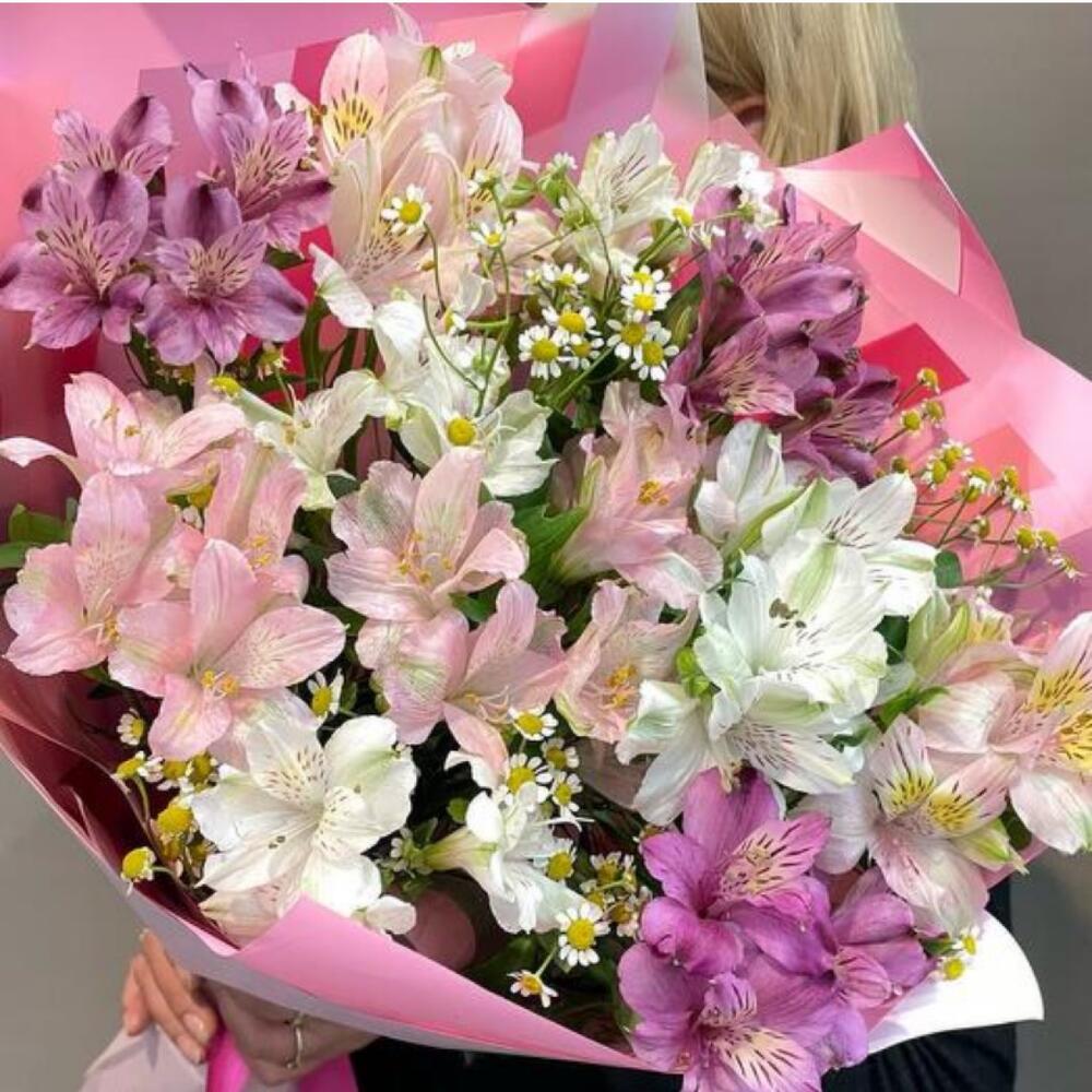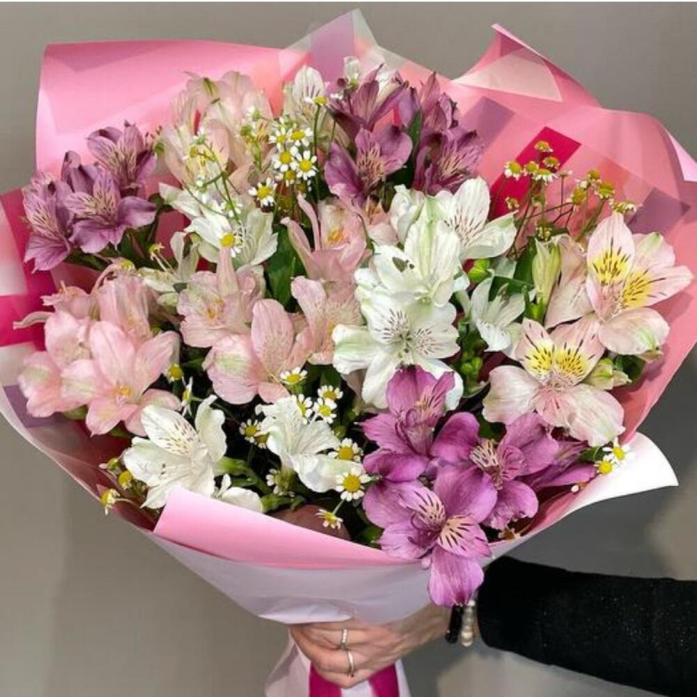 Танацетум камилла - 3 шт. стильное оформление - 2 шт. альстромерия микс европа - 7 шт.
