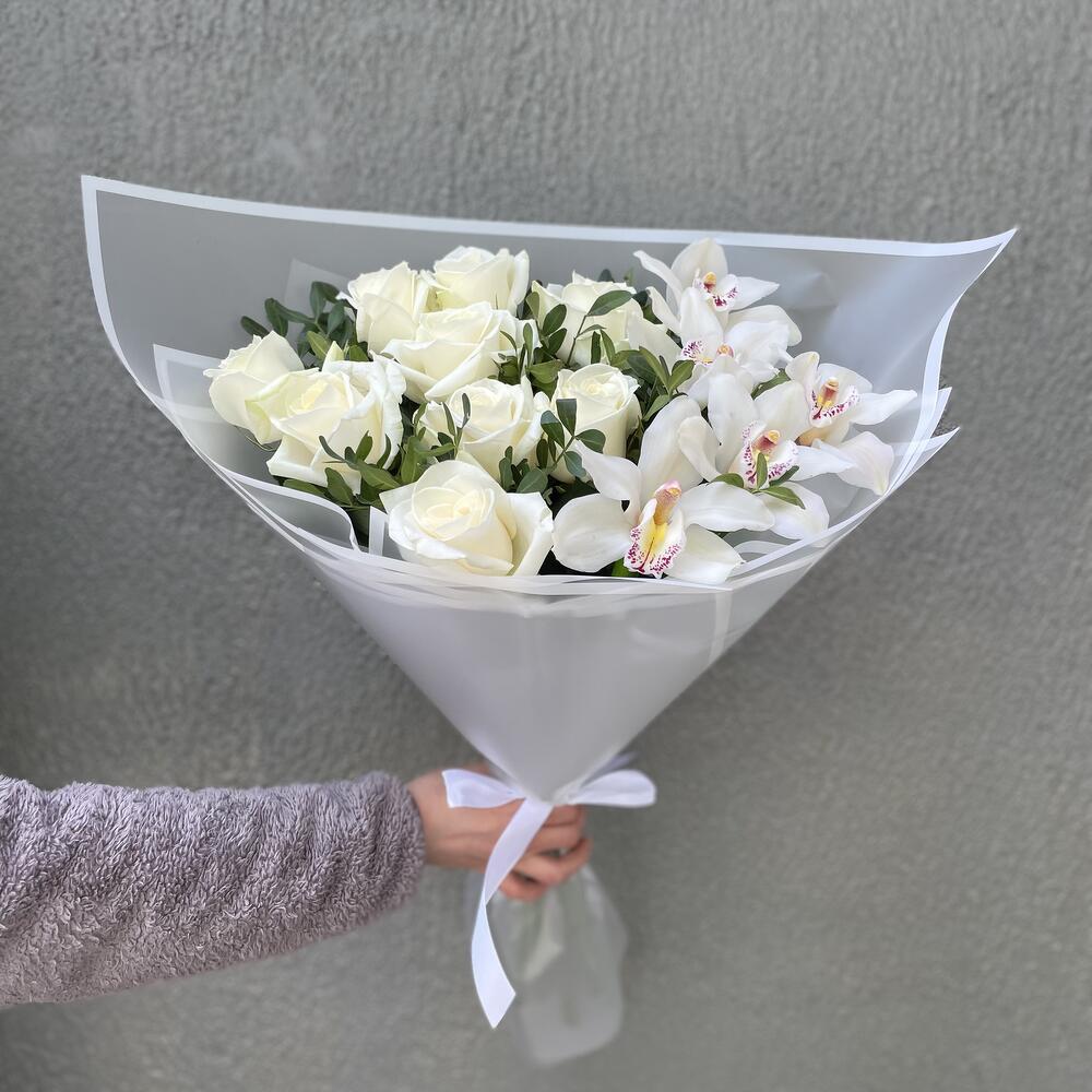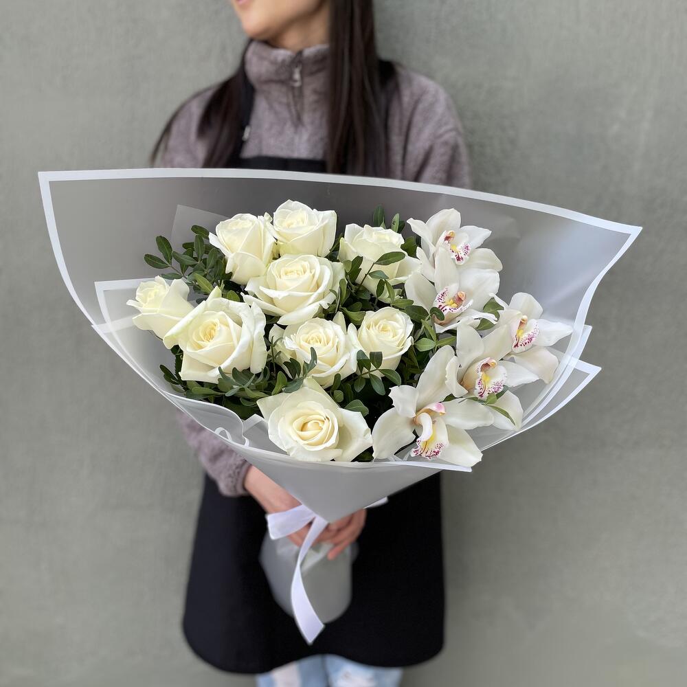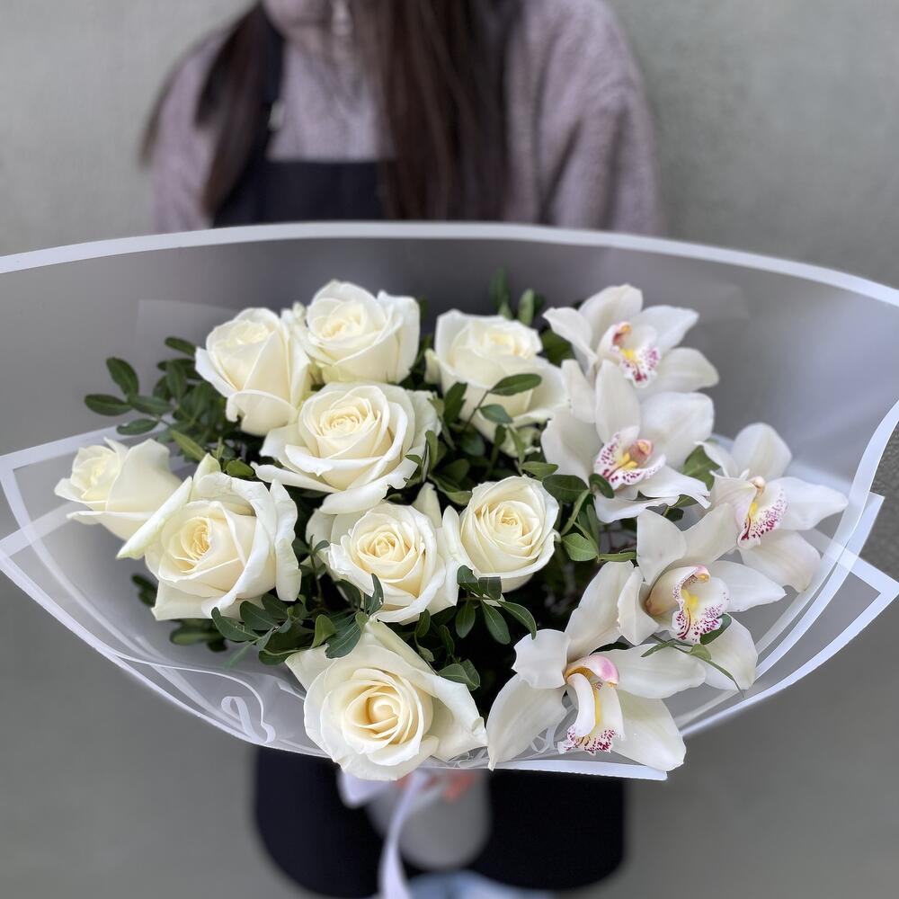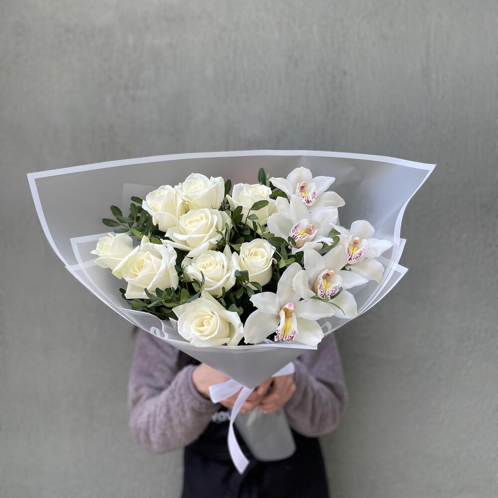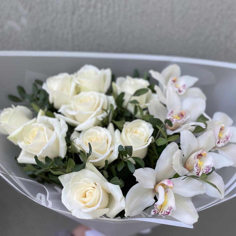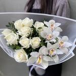 Букет орхидея с розами аваланш