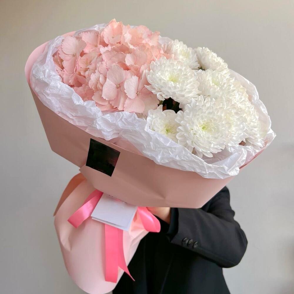 Элегантный букет из розовой гортензии и белой хризантемы – воплощение изысканности и стиля. Роскошные цветы, идеально подобранные по форме и цвету, создают неповторимую композицию, которая станет украшением любого торжества или станет прекрасным дополнением к интерьеру. Закажите элегантность и безупречный вкус! Он отлично подойдет для дня рождения, юбилея , день мамы , 8 марта , и просто для внимания 🦩