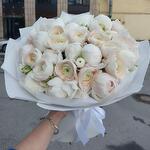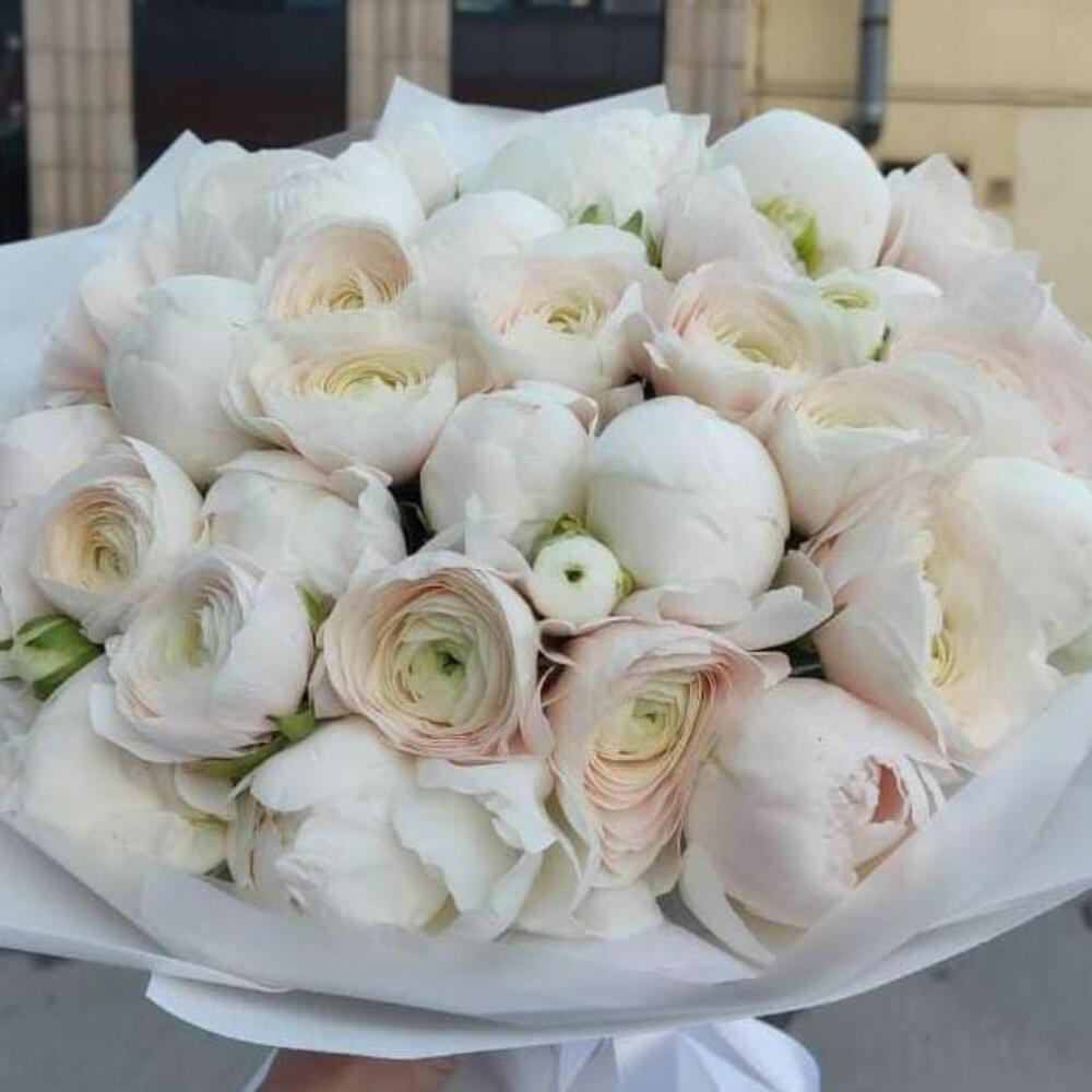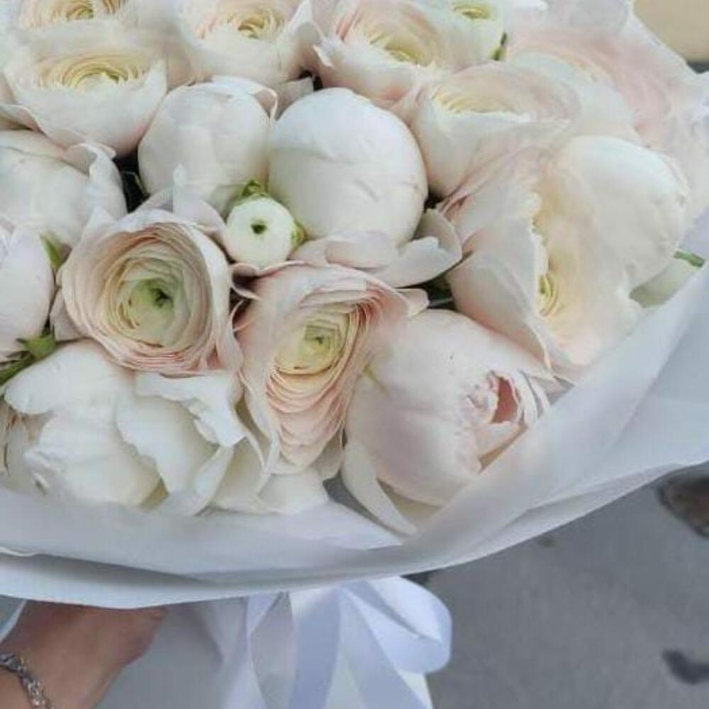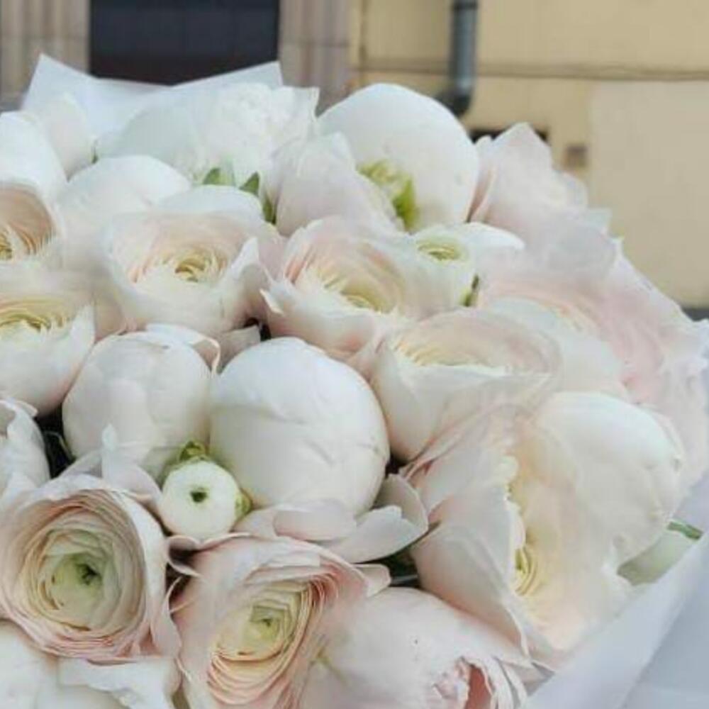 Лента атласная - 1 шт. Открытка - 1 шт. Упаковка дизайнерская - 1 шт. пионы - 15 шт. ранункулюсы - 20 шт. отличное настроение - 1000 шт.