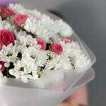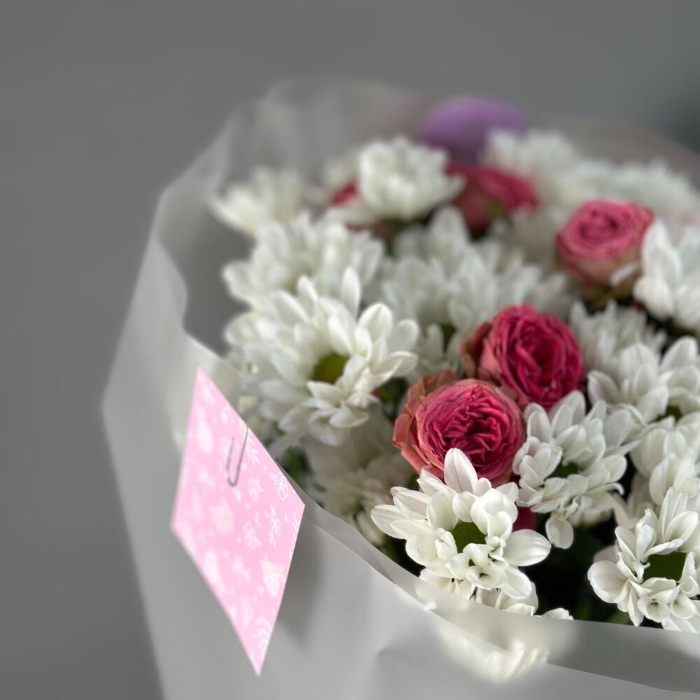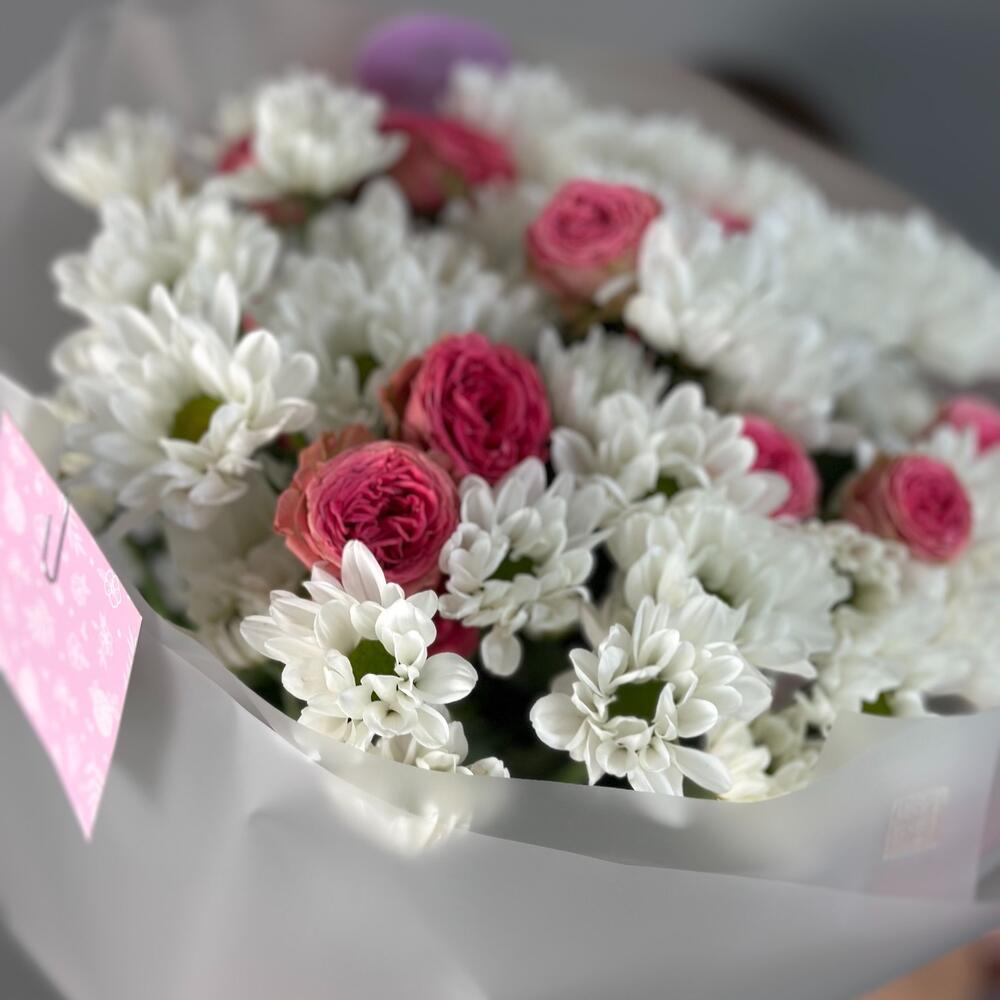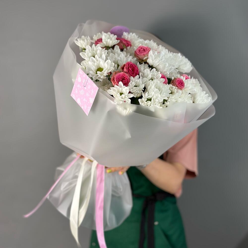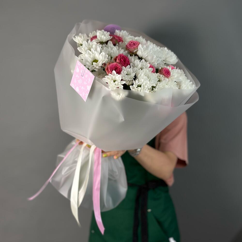 Хризантема кустовая - 5 шт. Лента атласная - 1 шт. Упаковка дизайнерская - 2 шт. роза кустовая кения - 3 шт.