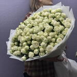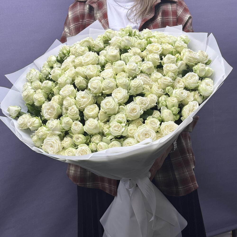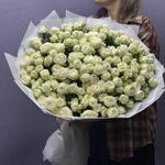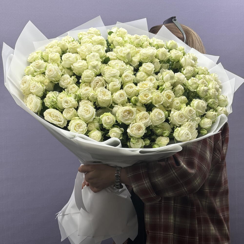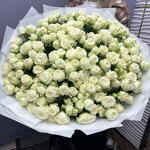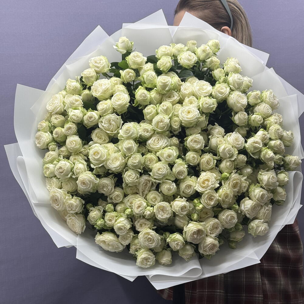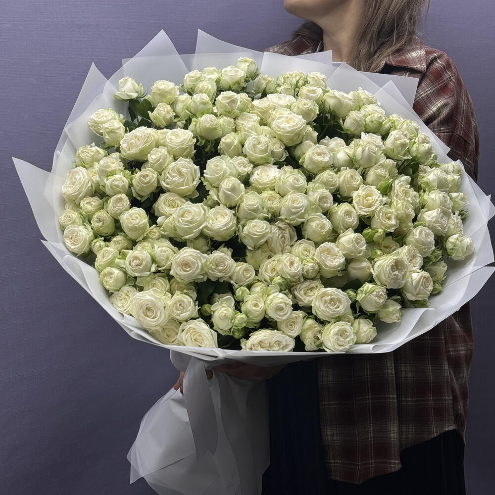 Лента атласная - 1 шт. Упаковка дизайнерская - 9 шт. белая кустовая пионовидная роза - 51 шт.
