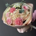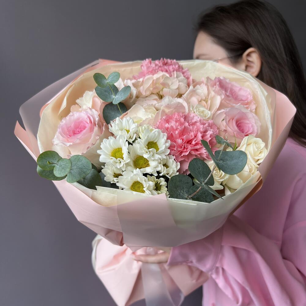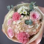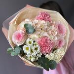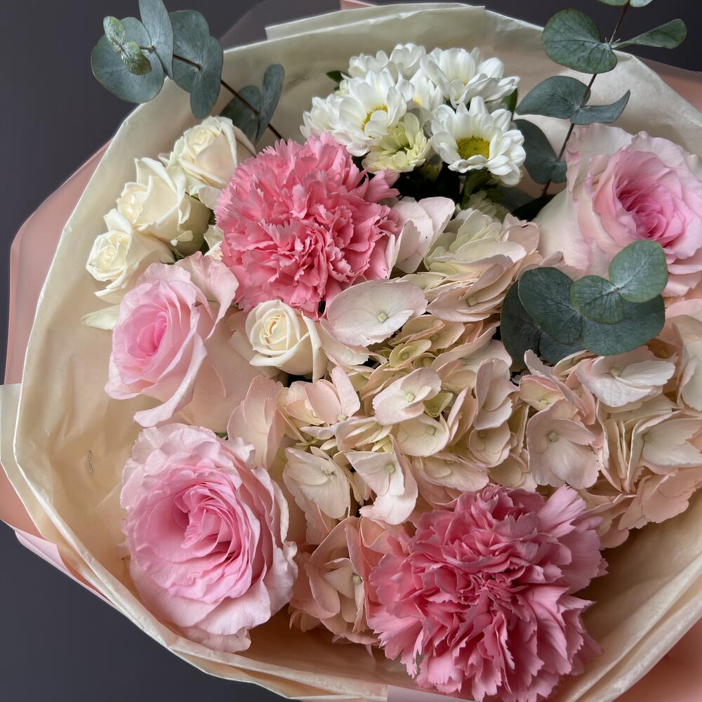 Гортензия - 1 шт. Роза кустовая - 1 шт. Хризантема кустовая - 1 шт. Эвкалипт - 2 шт. Гвоздика - 2 шт. Роза пионовидная - 3 шт. авторская упаковка с лентой - 1 шт.