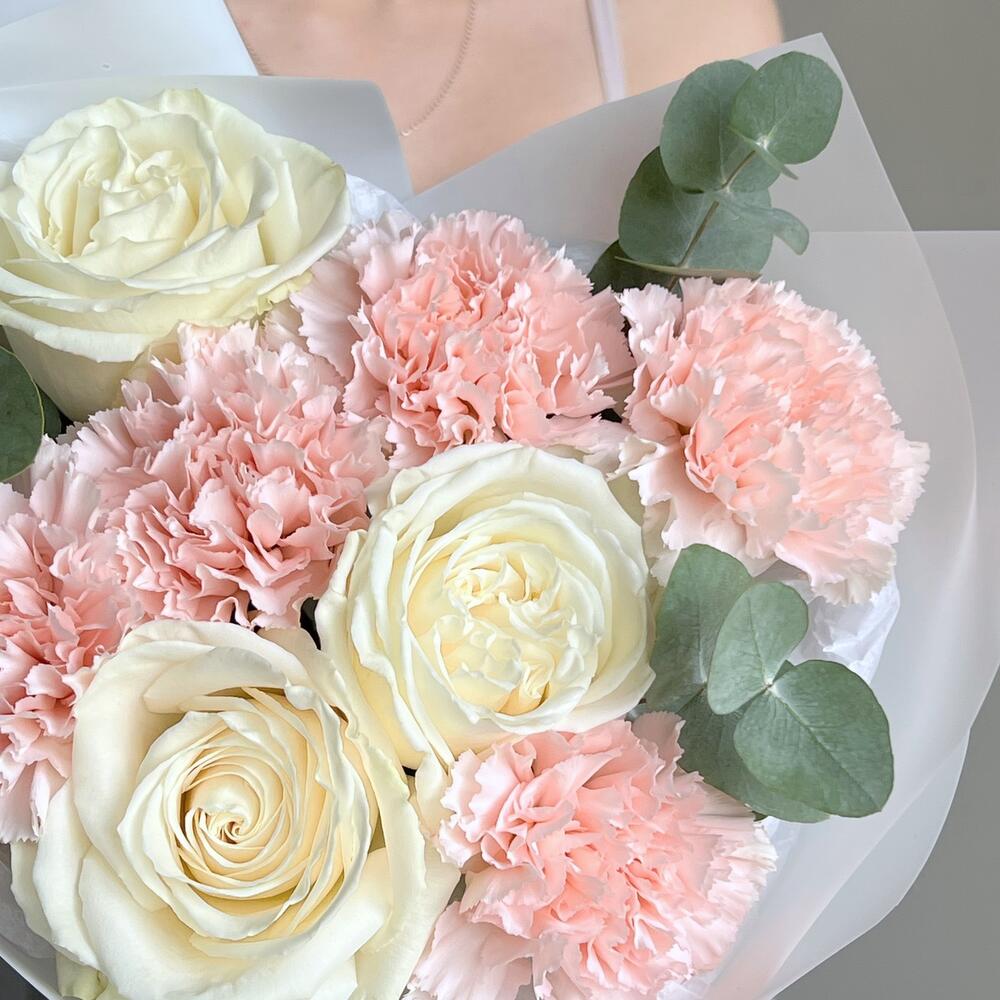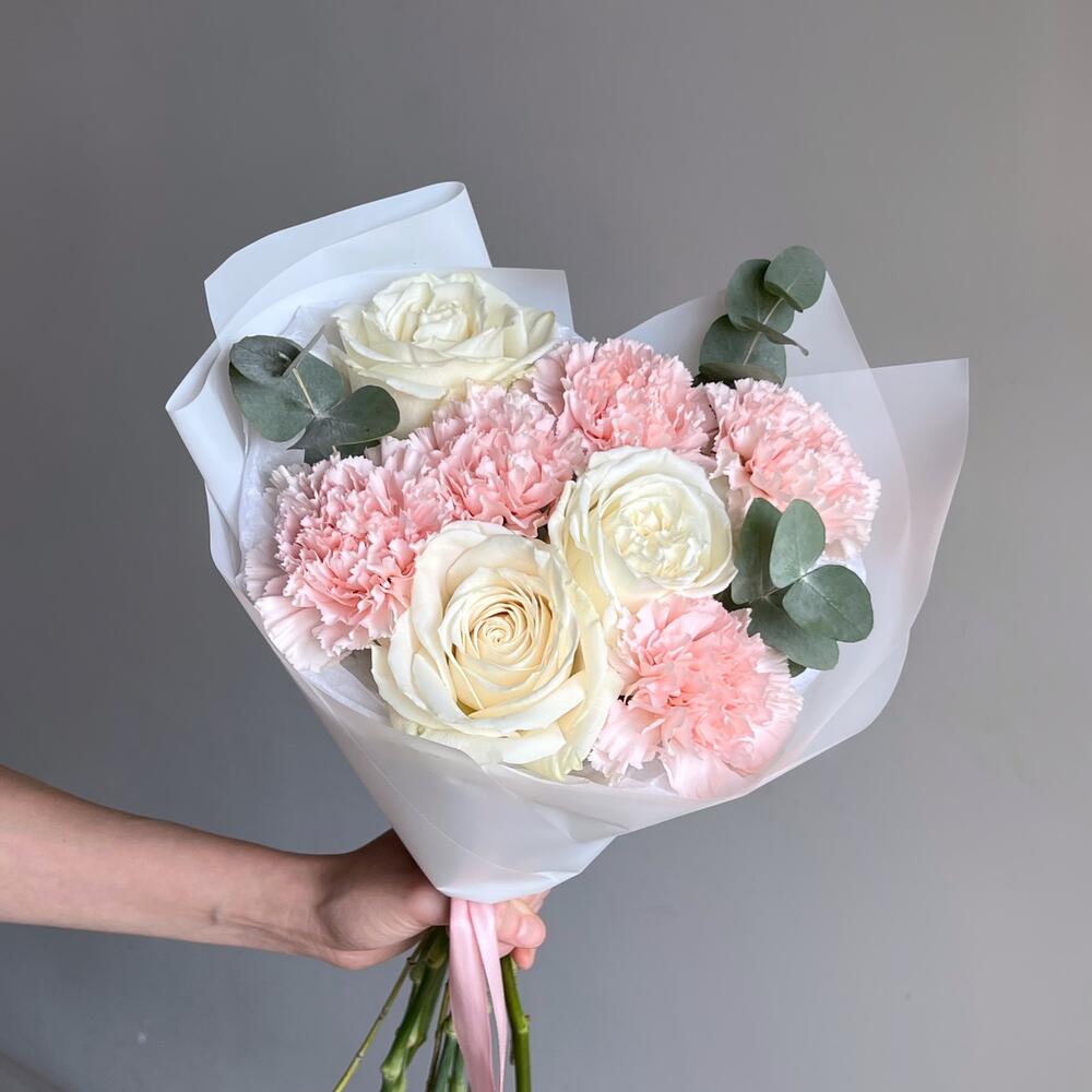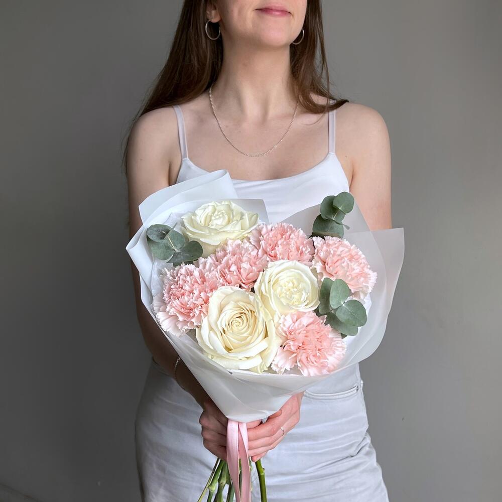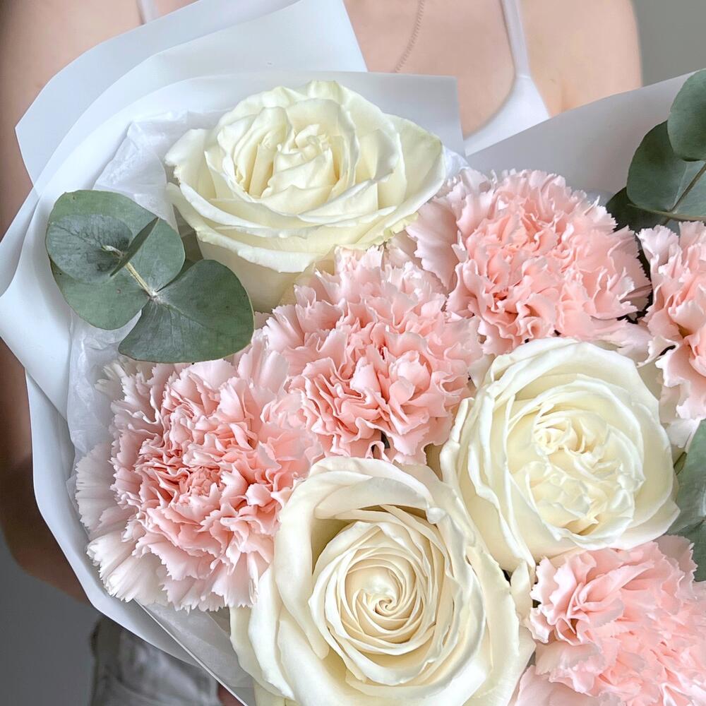 Нежный букет в пастельных оттенках с белыми розами, эвкалиптом и диантусом! :) Идеален на день рождения, 14 февраля, 8 марта, годовщину, свадьбу, свидание, День матери или просто без повода. Для вашего удобства все наши букеты доставляются в воде! Не забудьте подрезать цветы НЕПОСРЕДСТВЕННО перед тем как ставить в вазу (после подрезки в течении 2-3 секунд поставьте в воду). Не храните букет на прямых солнечных лучах и возле отопительных приборов, чтобы сохранить цветы свежими как можно дольше. Обратите внимание на размеры букета и фото в полный рост с человеком, для понимания размера композиции, это фото есть в карточке товара :)