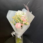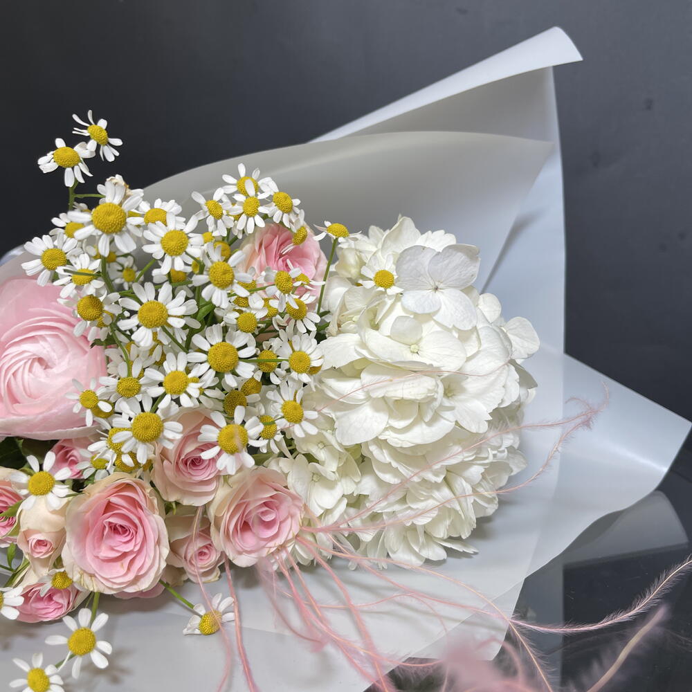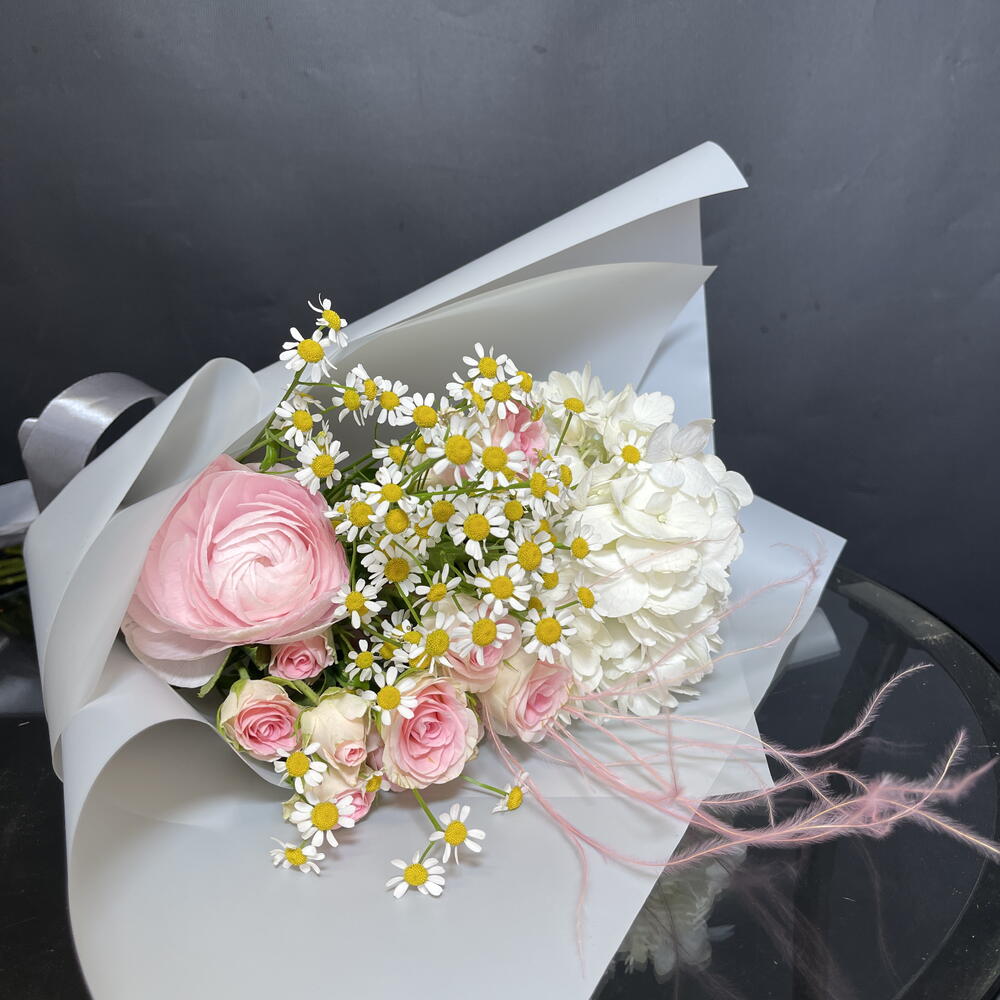 Роза кустовая - 2 шт. Танацетум - 3 шт. Ранункулюс - 1 шт. Гортензия белая - 2 шт. Стильная упаковка - 1 шт. ковил - 7 шт.