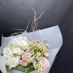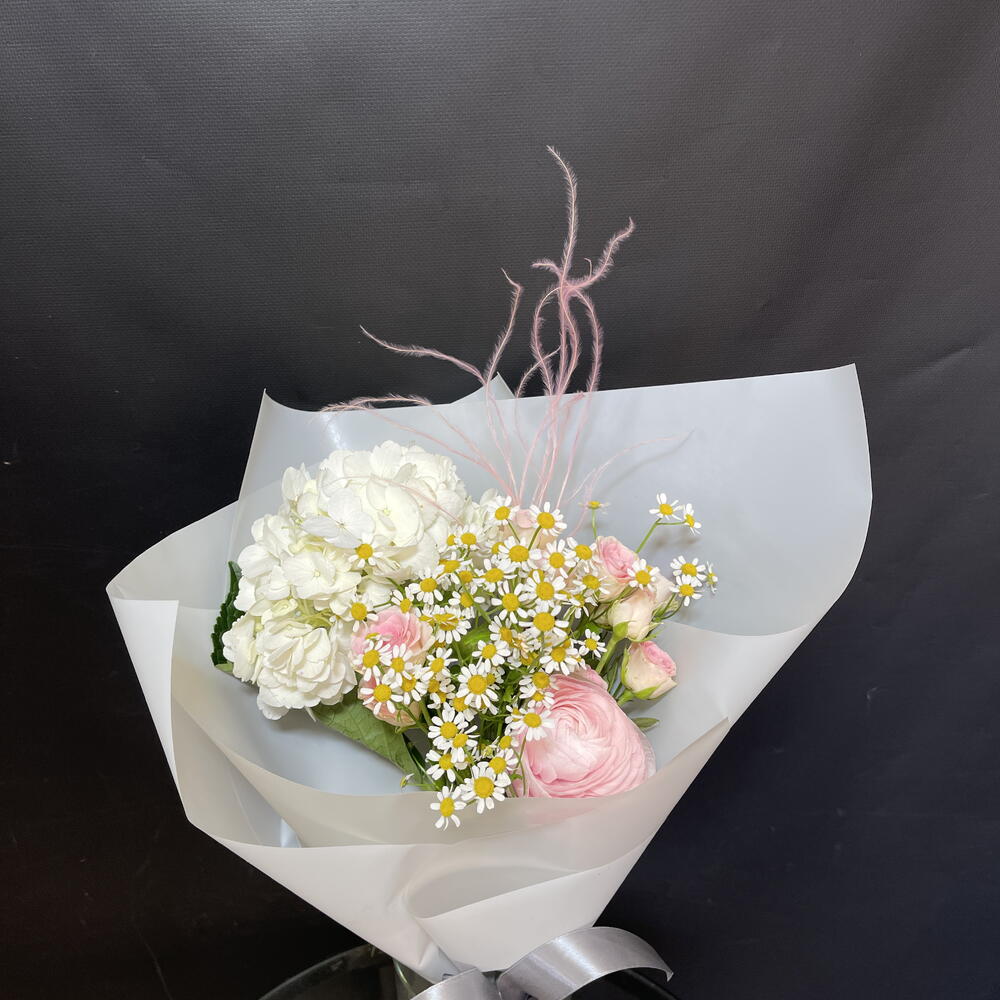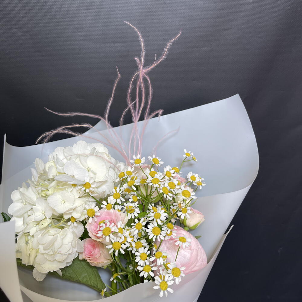 Авторский букет с белой гортензией, нежным ранункулюсом, игривым танацетумом. Изюминкой смотрится ковил. Стильная упаковка в пленку вуаль. НеПростоЦветы - создаем стиль и красоту для вашего настроения и выражения чувств.