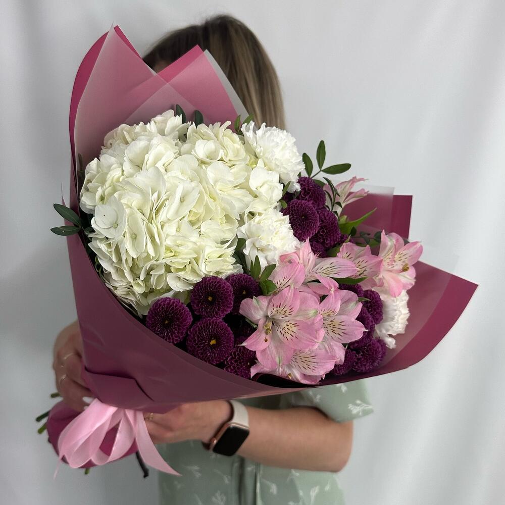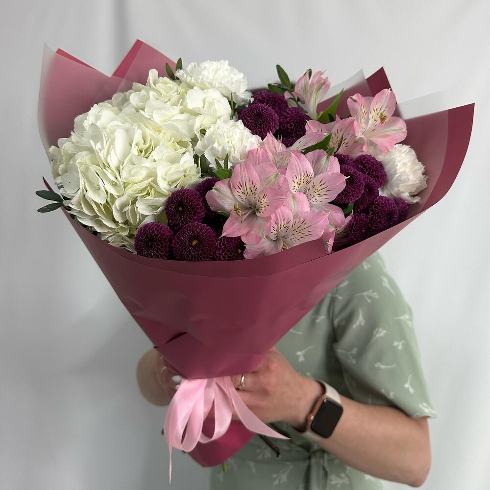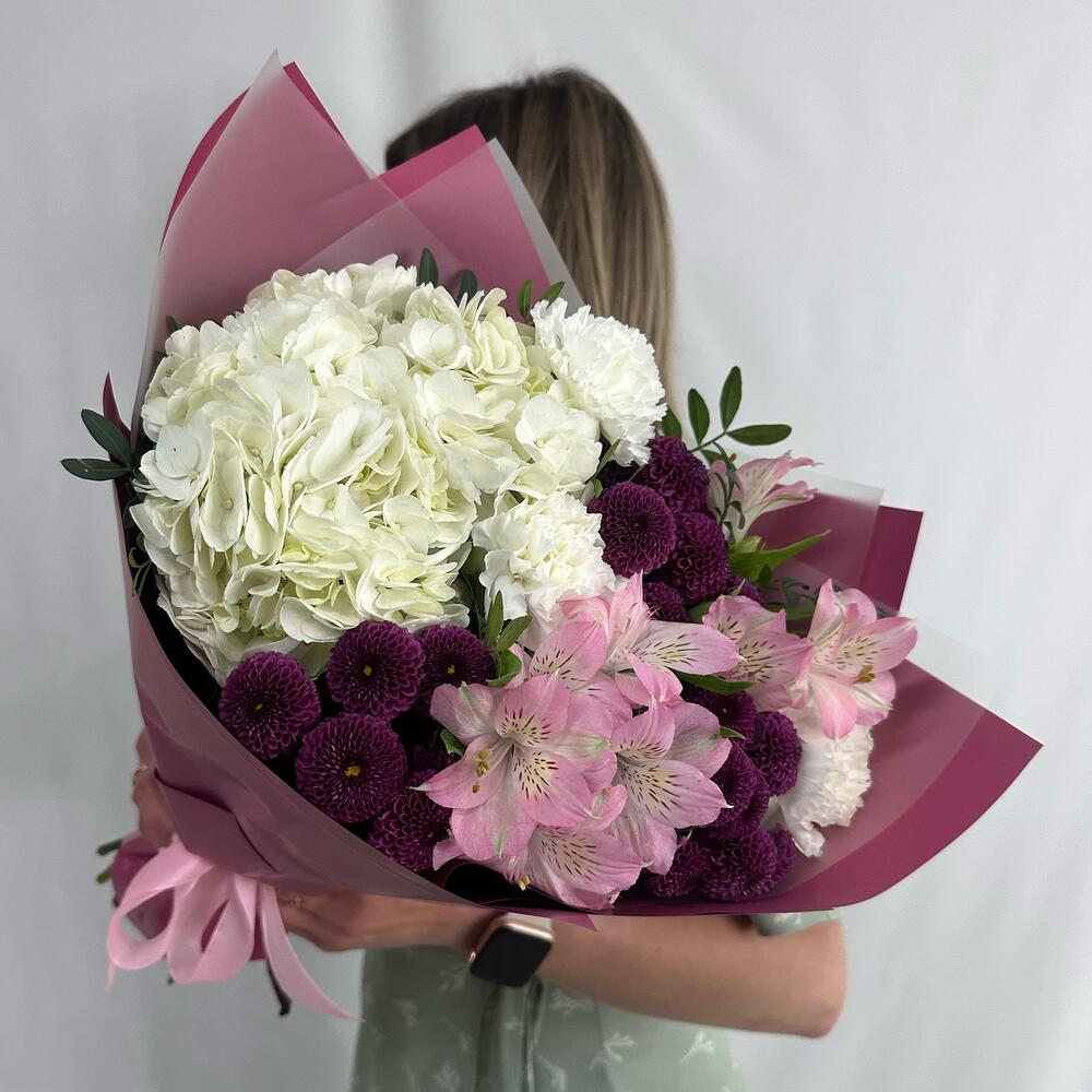 Альстромерия - 2 шт. Гортензия - 1 шт. Диантус - 3 шт. Сантини - 3 шт. Фисташка - 3 шт. Упаковка дизайнерская - 2 шт.