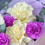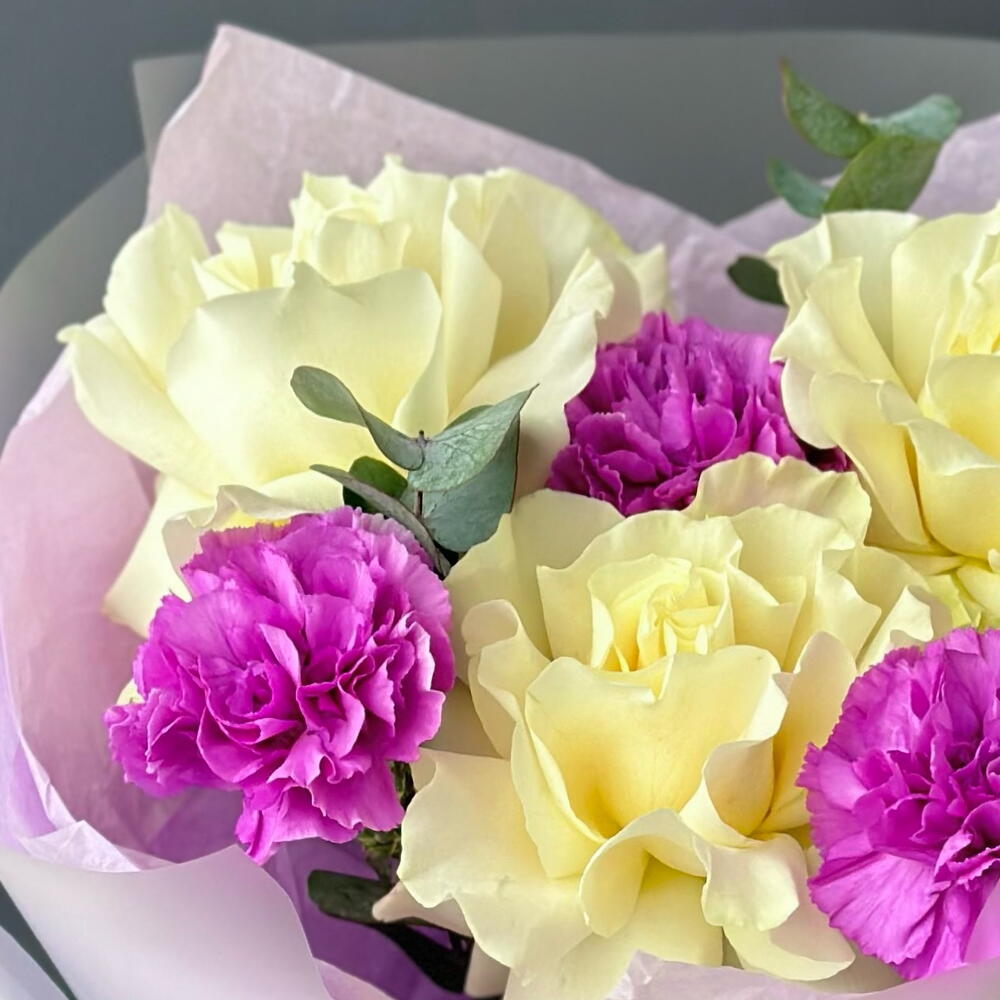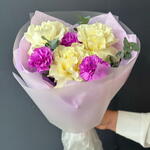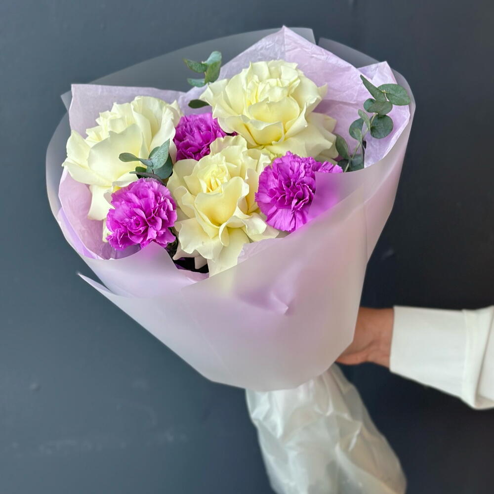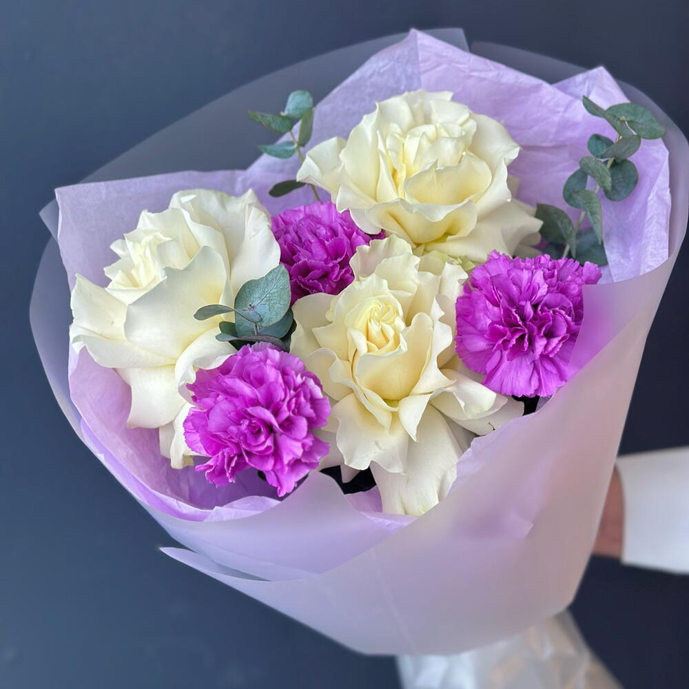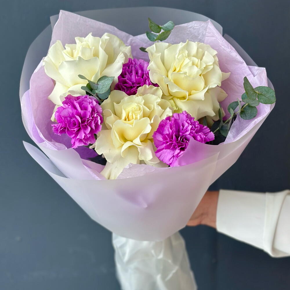Диантус - 3 шт. Упаковка дизайнерская - 1 шт. Роза французская - 3 шт. Эвкалипт Микс - 3 шт.