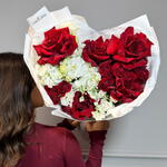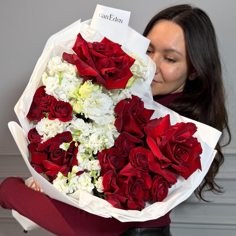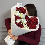Писташ - 1 шт. Роза кустовая пионовидная - 3 шт. Упаковка дизайнерская - 1 шт. Эустома алиса - 2 шт. маттиола кустовая - 3 шт. роза французская красная - 5 шт.
