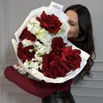 Роскошный букет в белых и бордовых оттенках с французскими розами и ароматной кустовой маттиолой