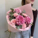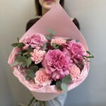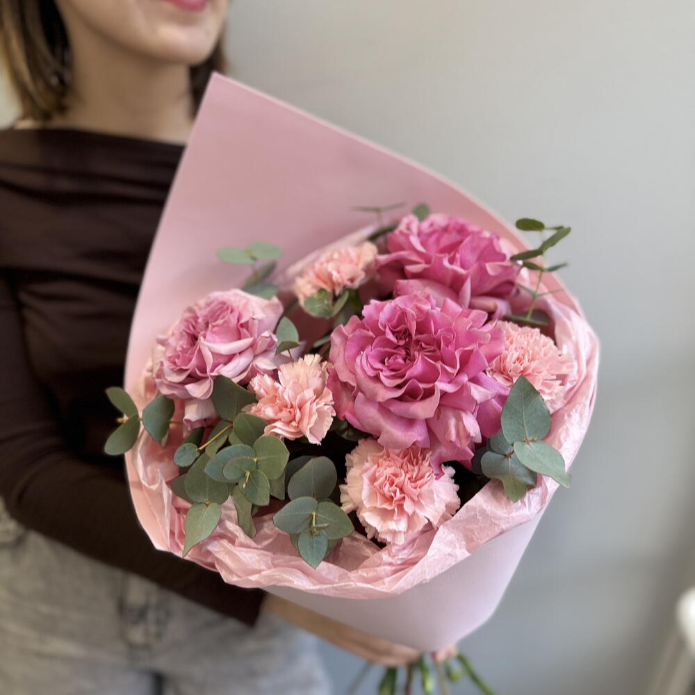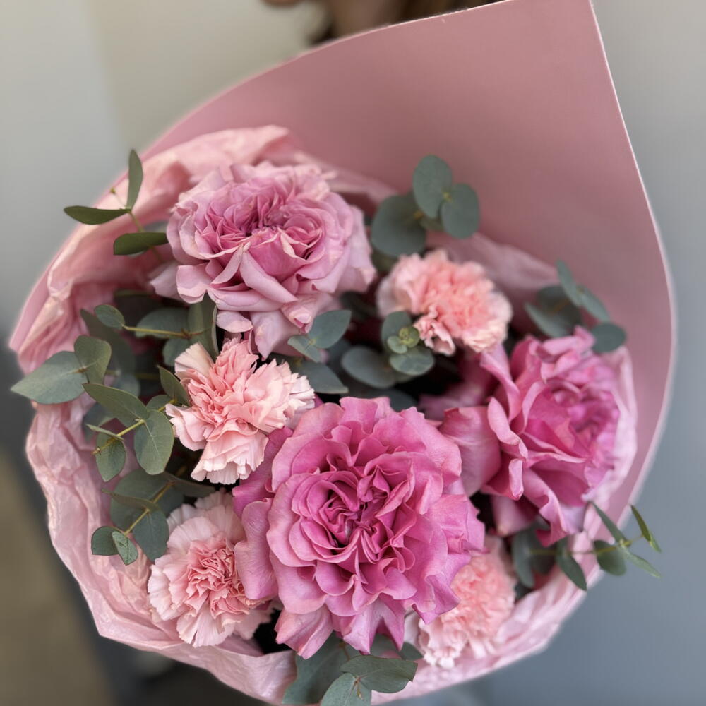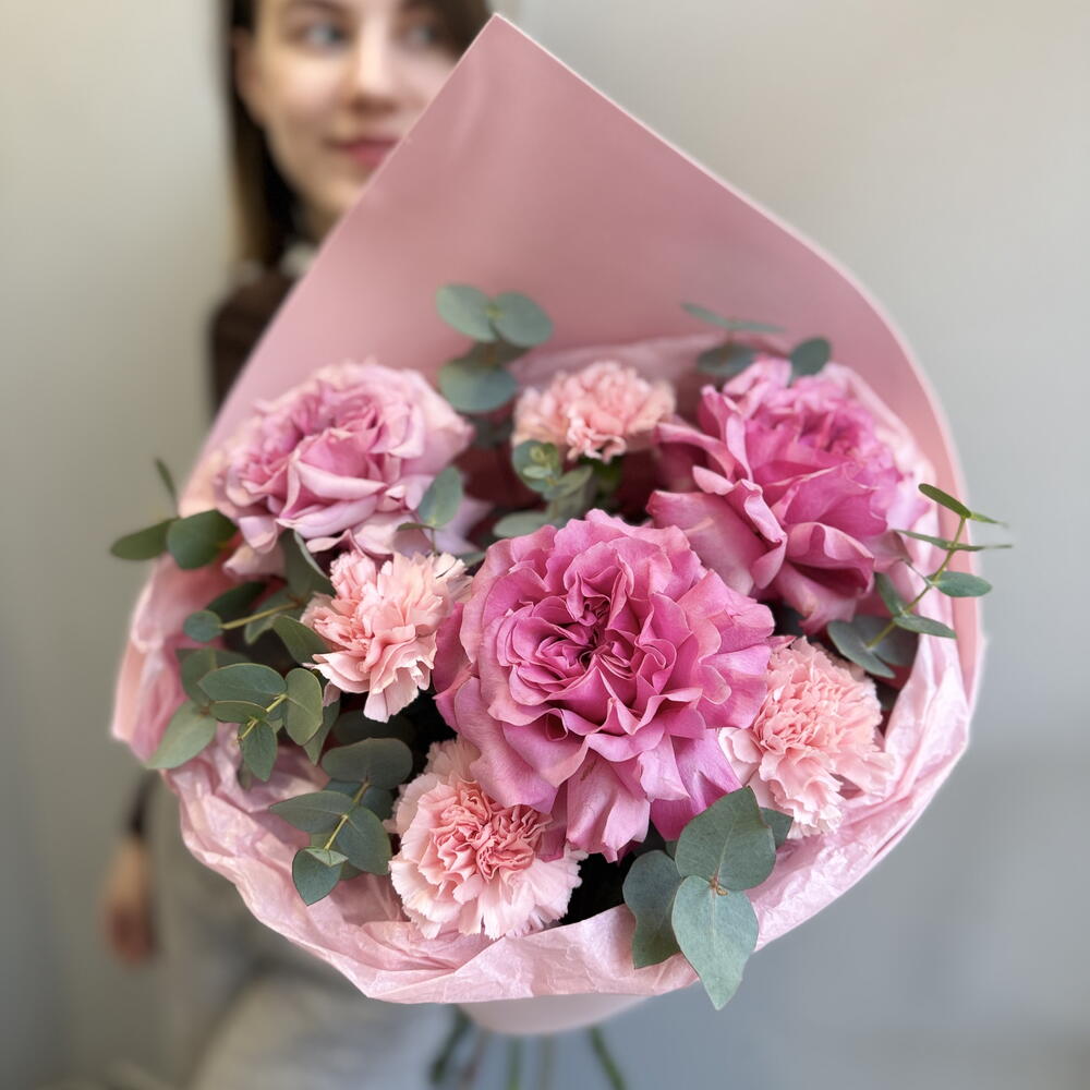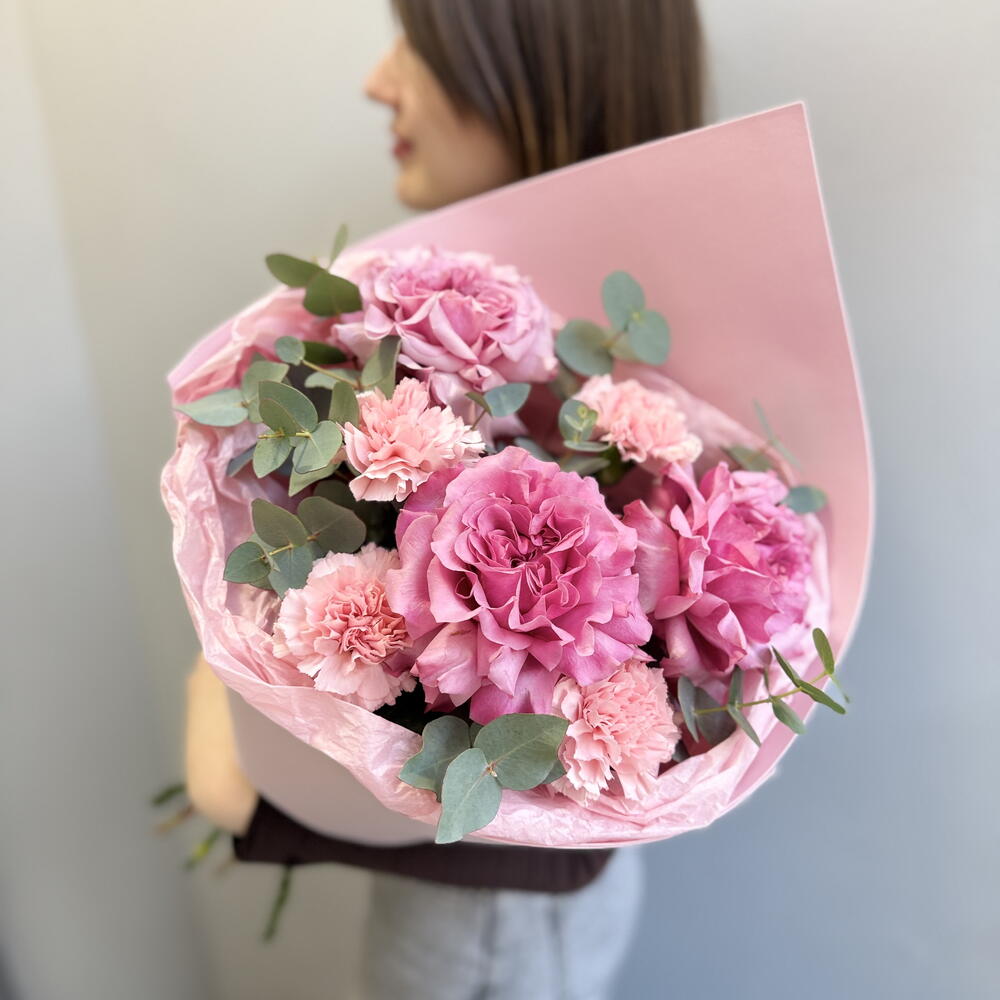 Букет с французскими розами кантри блюз, гвоздикой и эвкалиптом