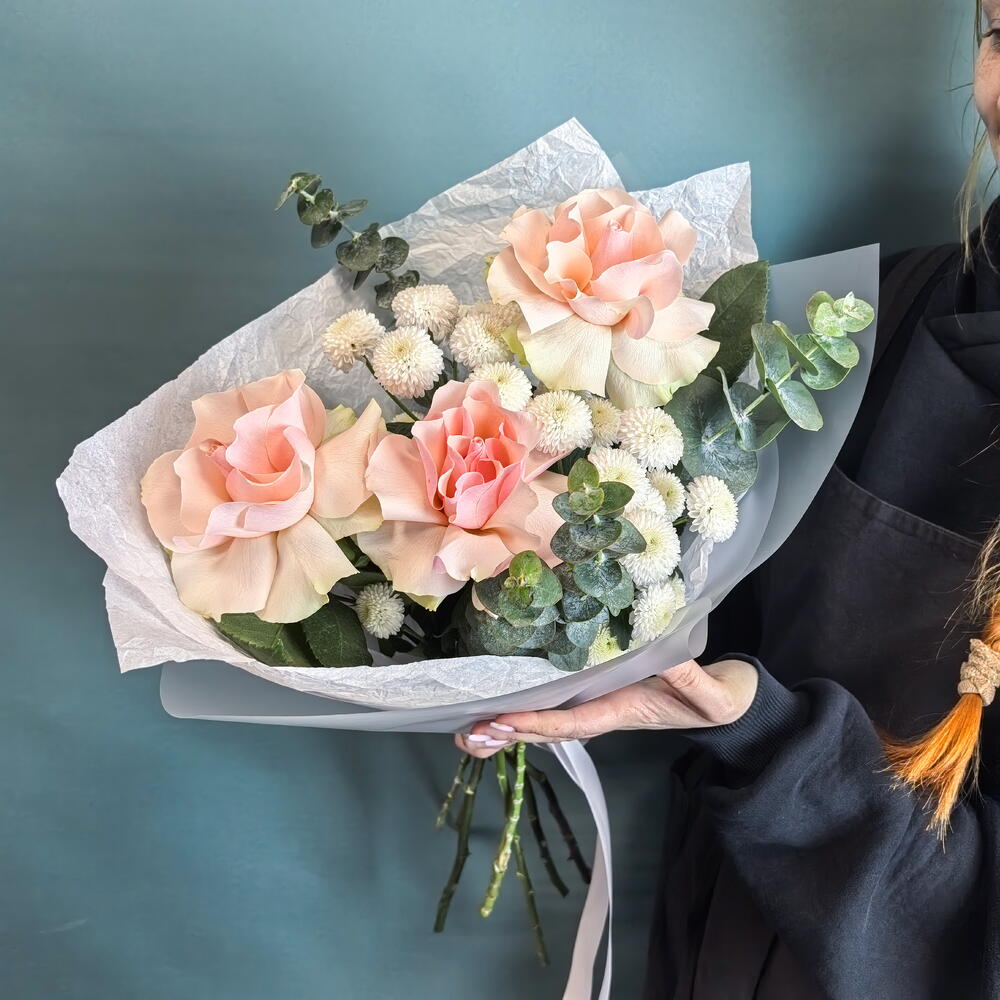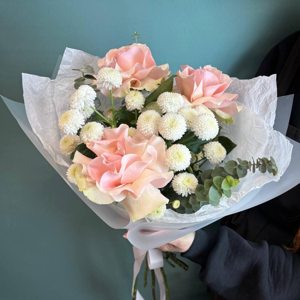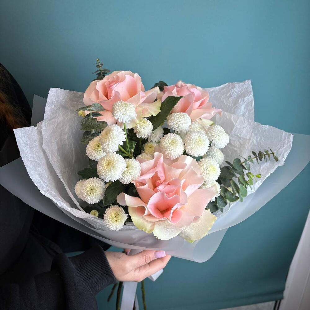 Эвкалипт - 2 шт. Упаковка дизайнерская - 1 шт. Французская роза - 3 шт. хризантема ньютон - 2 шт.