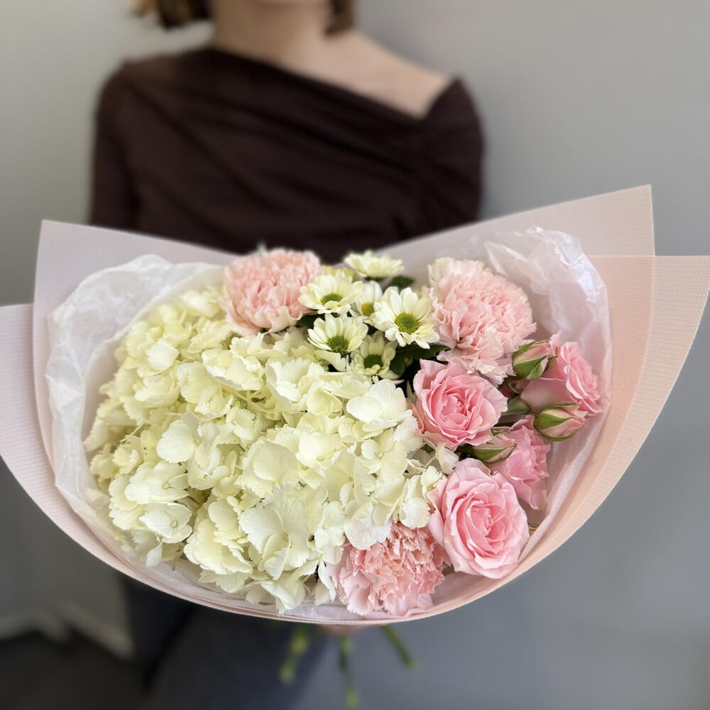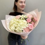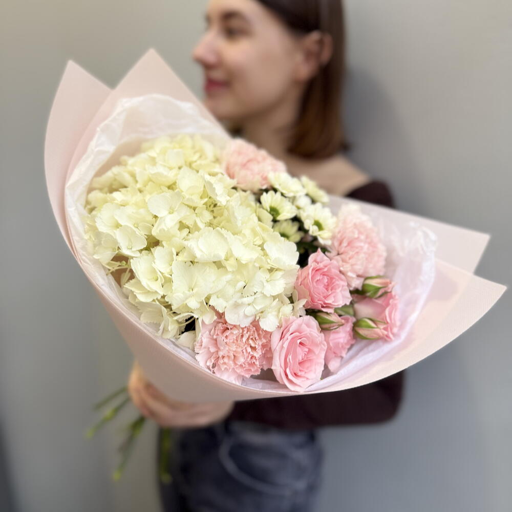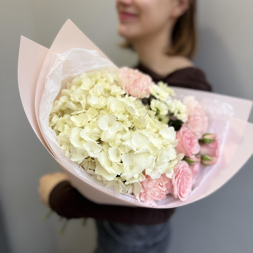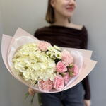 Букет с гортензией, гвоздиками и кустовой розой