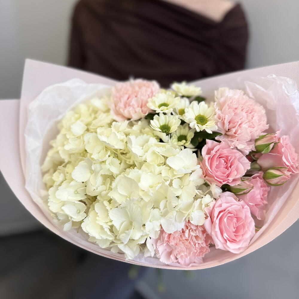 Гортензия - 1 шт. Роза кустовая - 1 шт. Гвоздика - 3 шт. Лента атласная - 1 шт. Тишью - 1 шт. Сантини - 1 шт. упаковка зефирка - 1 шт.