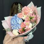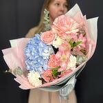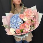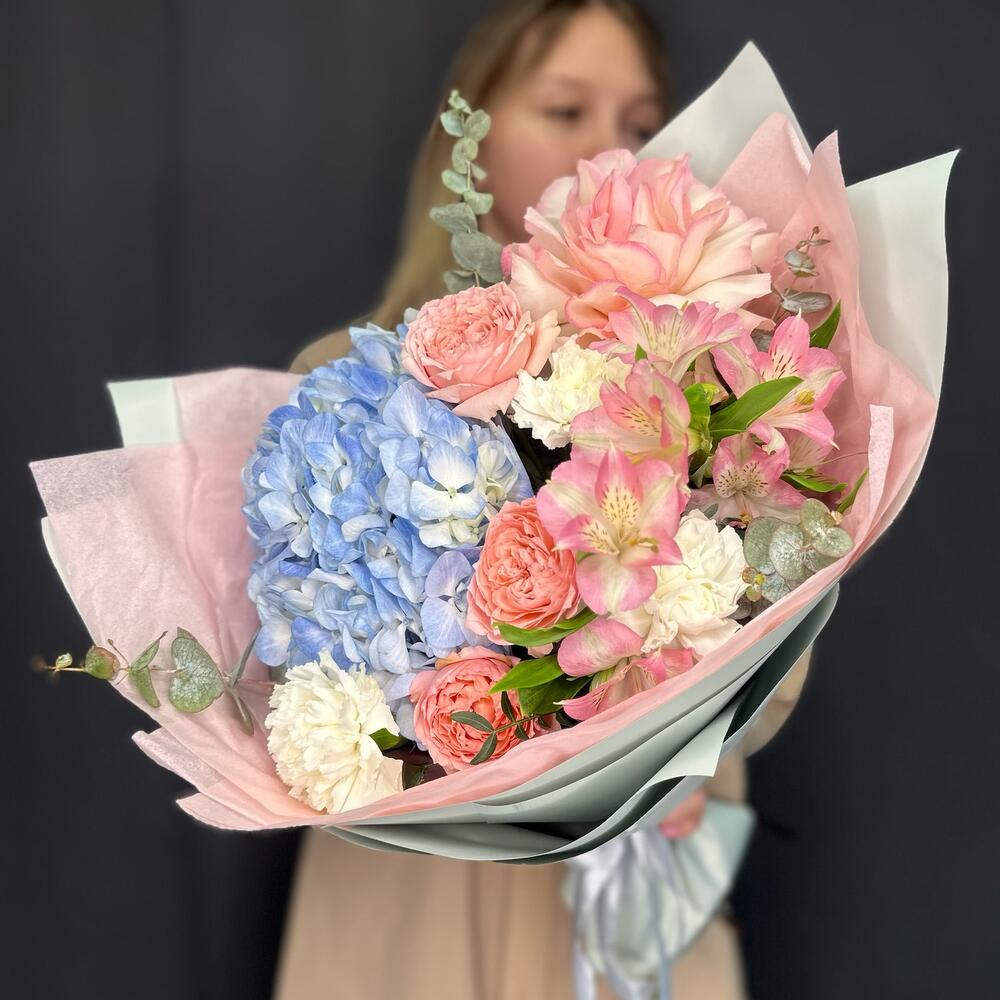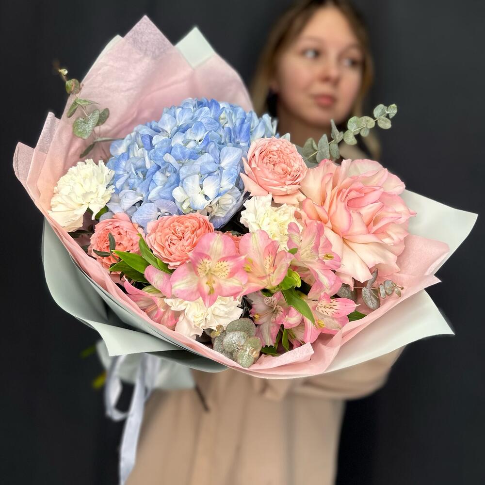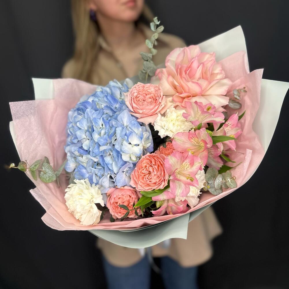 Альстромерия - 1 шт. Гортензия - 1 шт. Эвкалипт - 2 шт. Упаковка - 4 шт. Диантус - 3 шт. Фисташка - 3 шт. Эквадор роза - 1 шт. джульетта кустовая роза пионовидная - 1 шт.