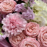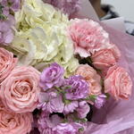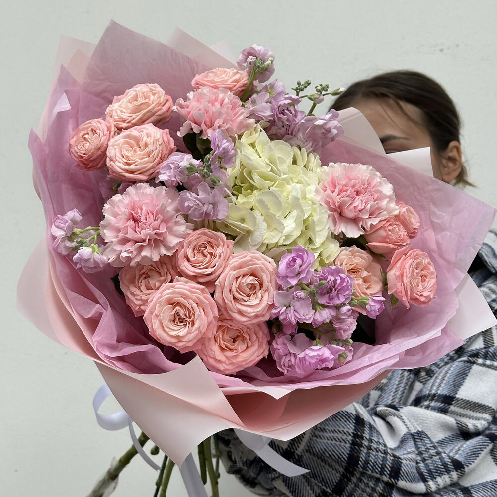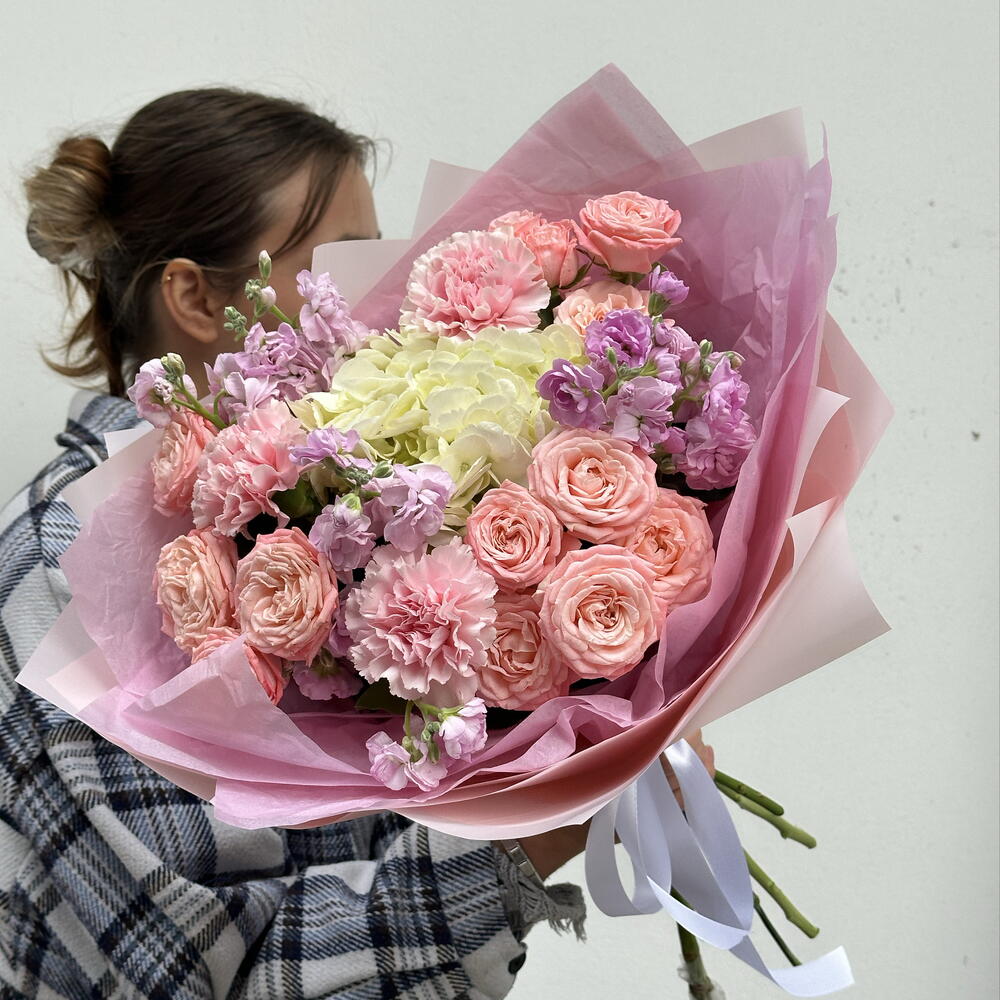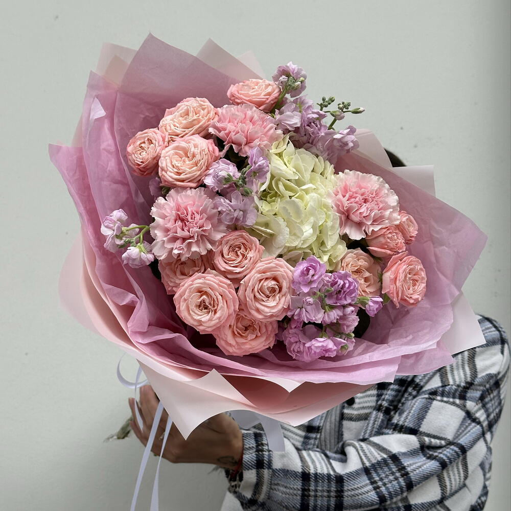 Гортензия - 1 шт. Диантус - 3 шт. Роза кустовая пионовидная - 3 шт. Упаковка дизайнерская - 4 шт. Лента атлас - 1 шт. Бумага тишью - 2 шт. маттиола кустовая - 3 шт.