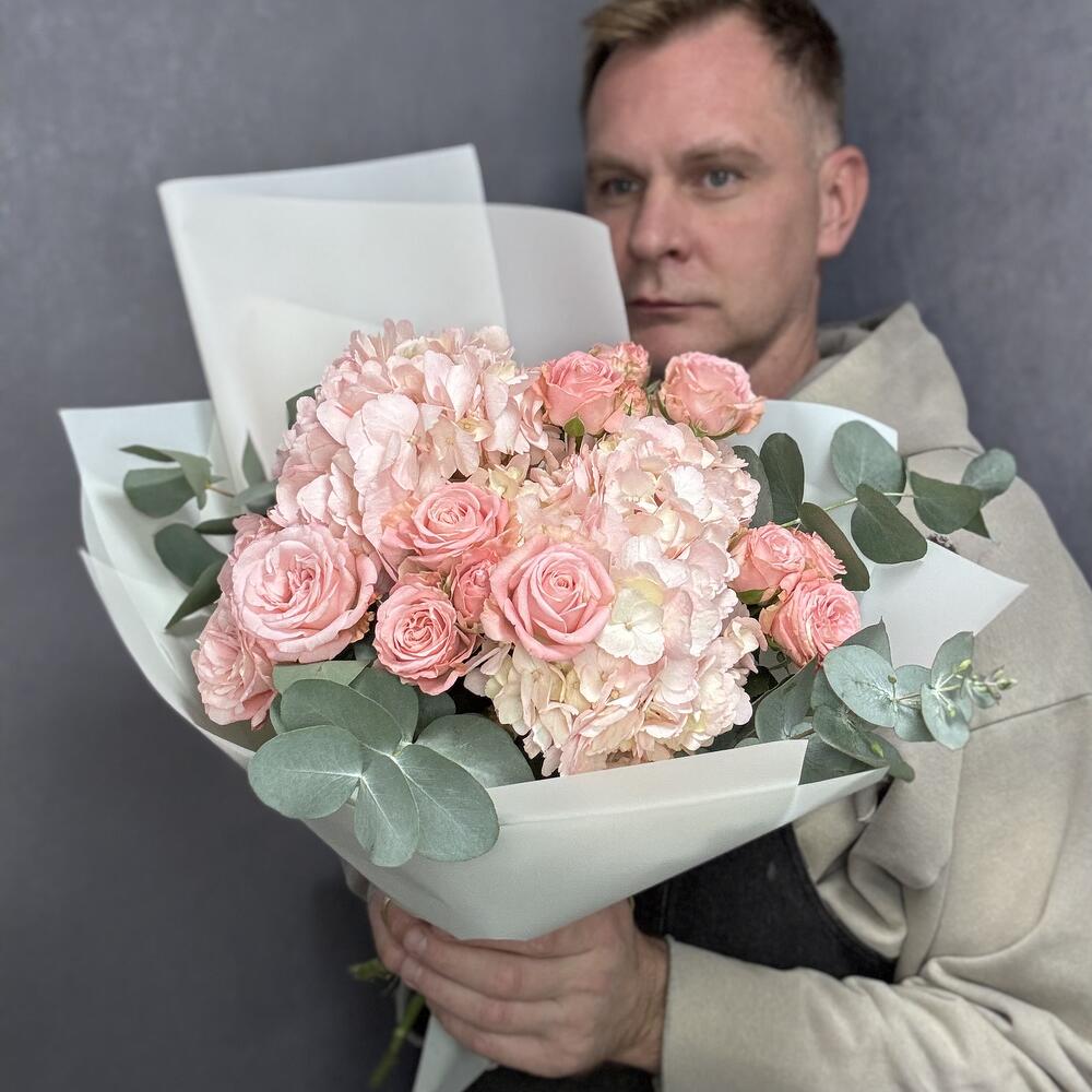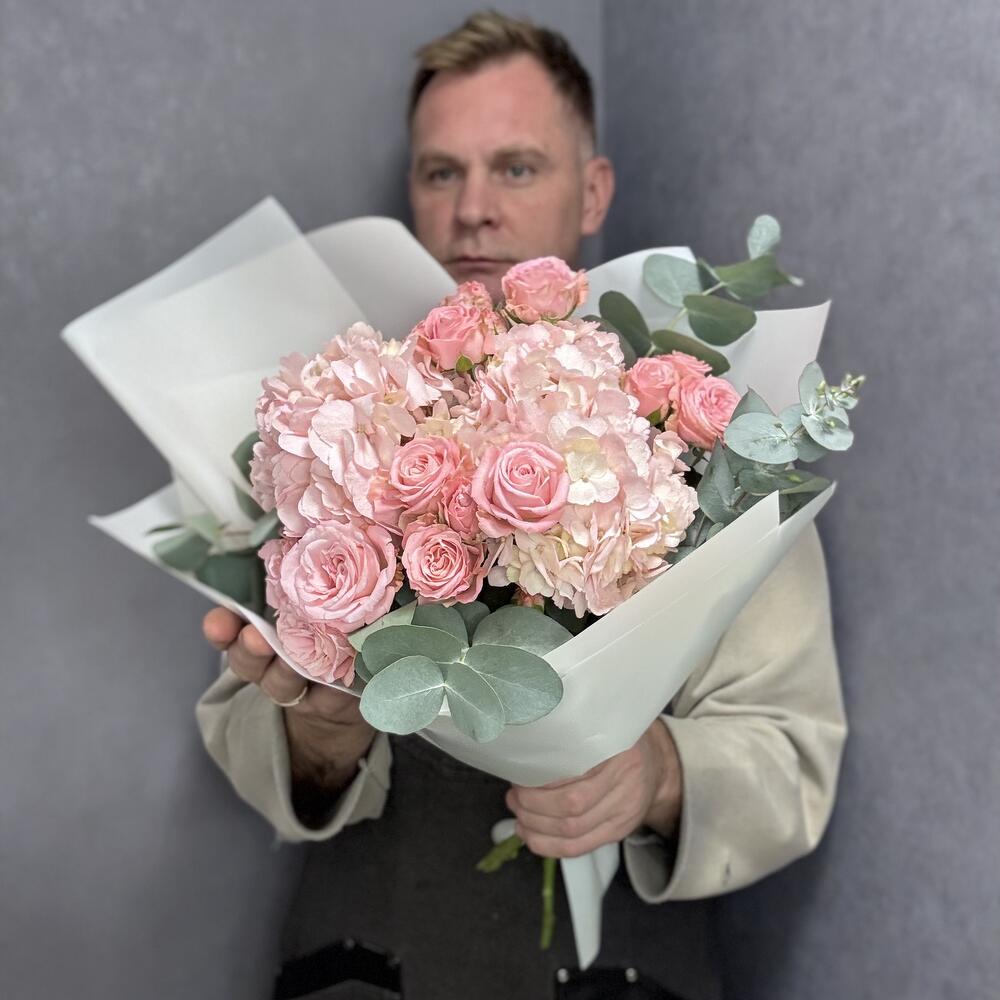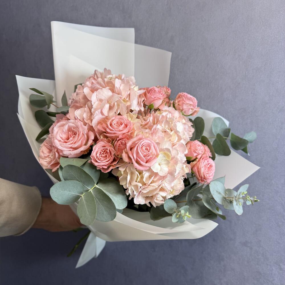 Эвкалипт - 4 шт. Упаковка дизайнерская - 1 шт. Гортензия розовая - 2 шт. мадам бомбастик кустовая роза - 4 шт.