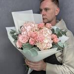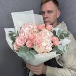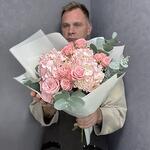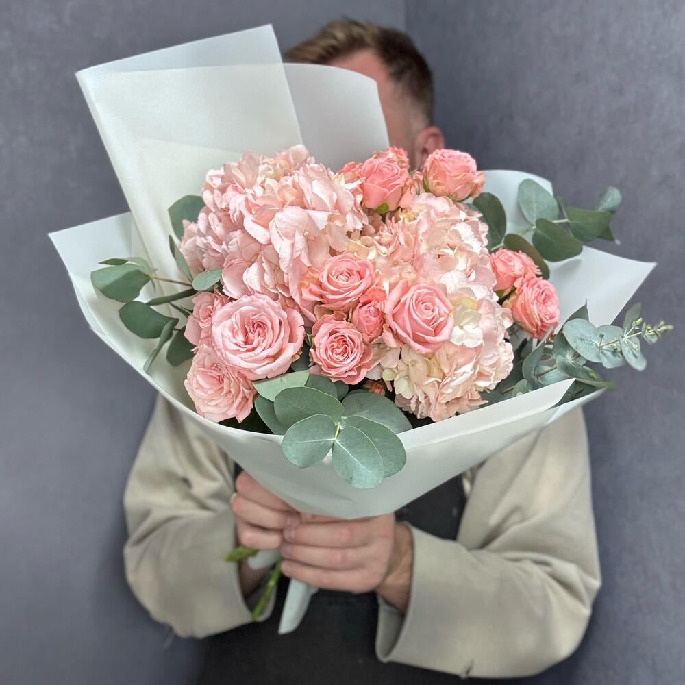 Розовый нежный букет с гортензиями и кустовыми пионовидными розами с веточками эвкалипта в стильной упаковке. Дополните свой подарок, добавив к нему мягкую игрушку или воздушный шарик! 🎈 Это сделает его ещё более особенным и запоминающимся. Ведь сюрпризы всегда радуют и удивляют! Инструкция по уходу за букетом: Держите цветы подальше от сквозняков и приборов отопления. Ежедневно обновляйте свежую воду в вазе и подрезайте стебли на 1-1,5 см. Не оставляйте букет без воды на время более 15 минут. Для композиций на флористической губке необходим полив через день небольшим количеством свежей воды в центр композиции. ❤️Добавляйте товар и наш магазин в избранное, чтобы было легче нас найти.
