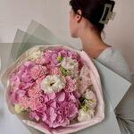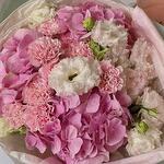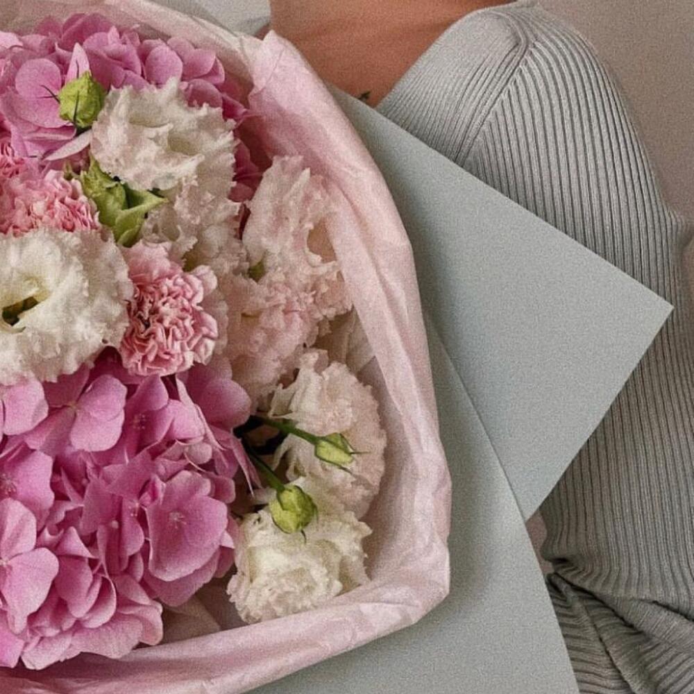 Гортензия - 3 шт. Гвоздика - 9 шт. Эустома - 5 шт. Открыточка с вашими пожеланиями - 1 шт. хорошее настроение - 1008 шт. упаковка дизайнерская с лентой - 1 шт.
