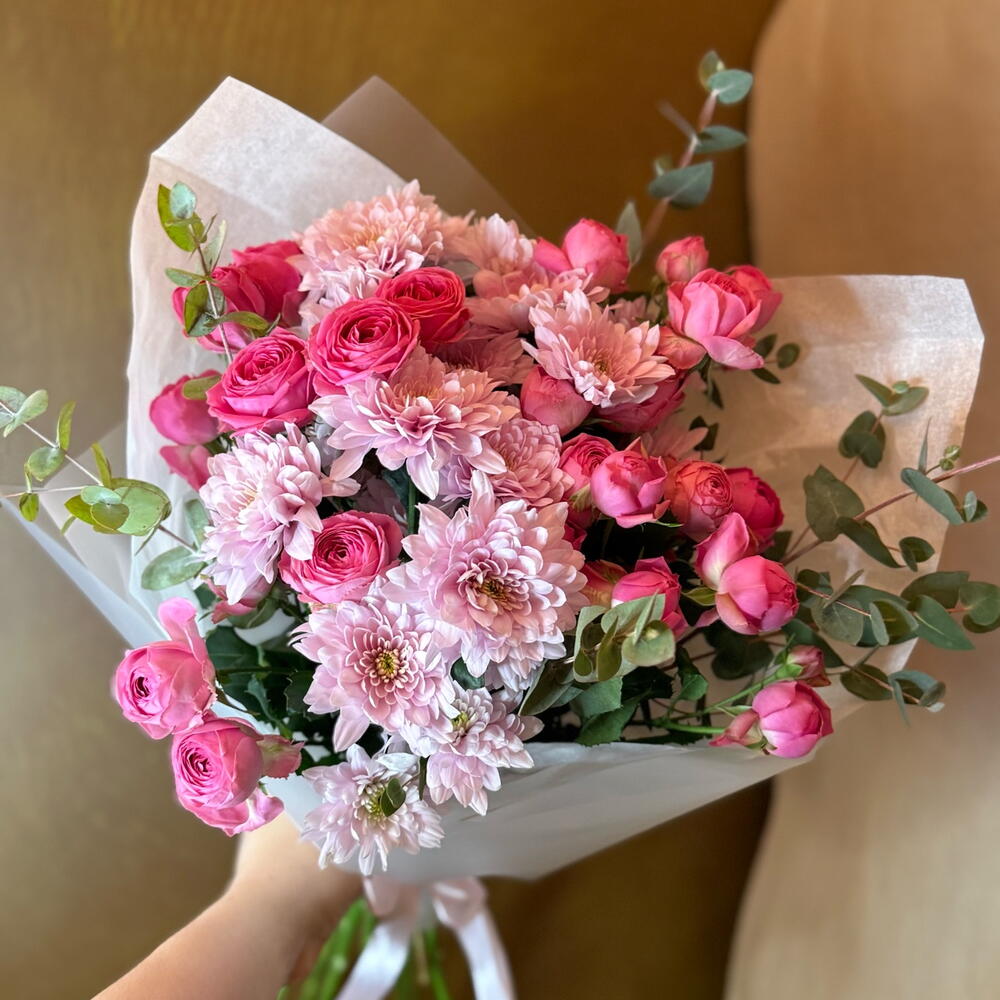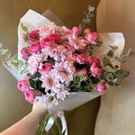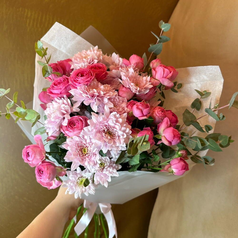Нежный букет с обворожительными хризантемами и кустовыми розами в корейском стиле