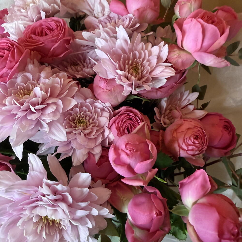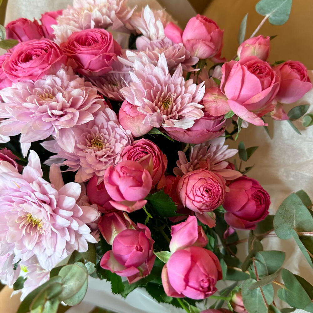 Букет с хризантемами и пионовидными розами с эвкалиптом