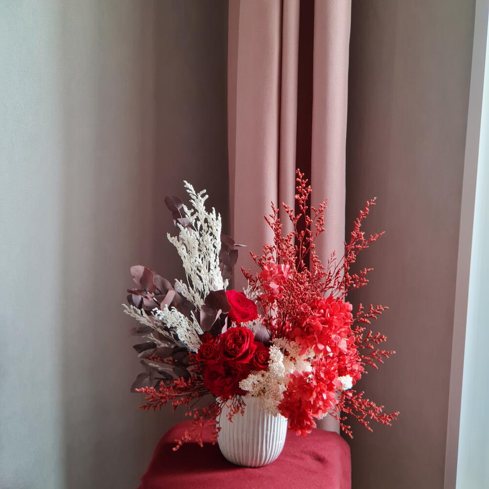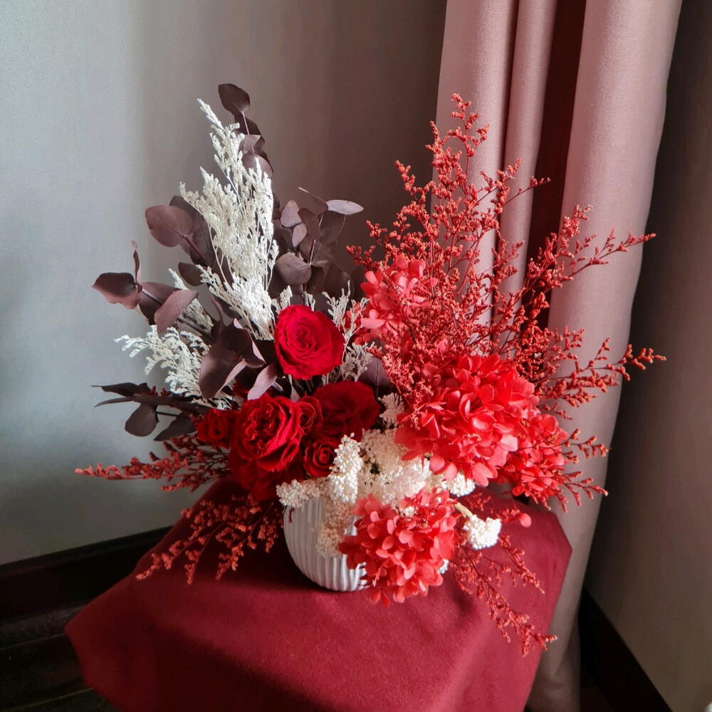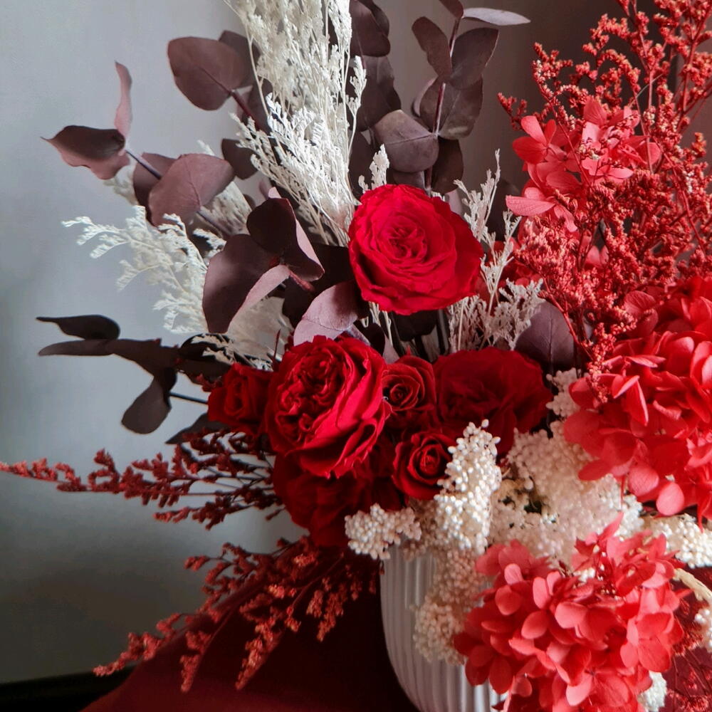 розы стабилизированные - 5 шт. эвкалипт стабилизированный бордовый - 100 гр. кермек стабилизированный - 50 гр. гортензия стабилизированная винная - 30 гр.