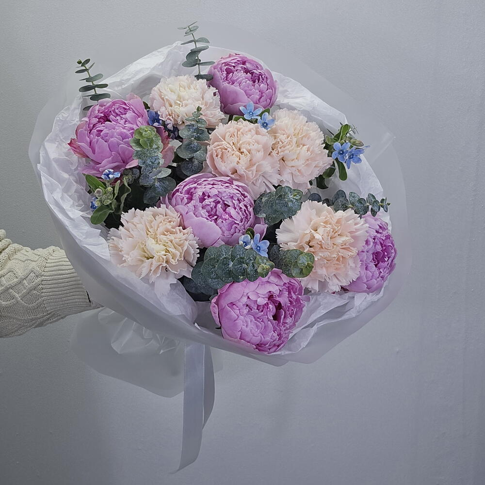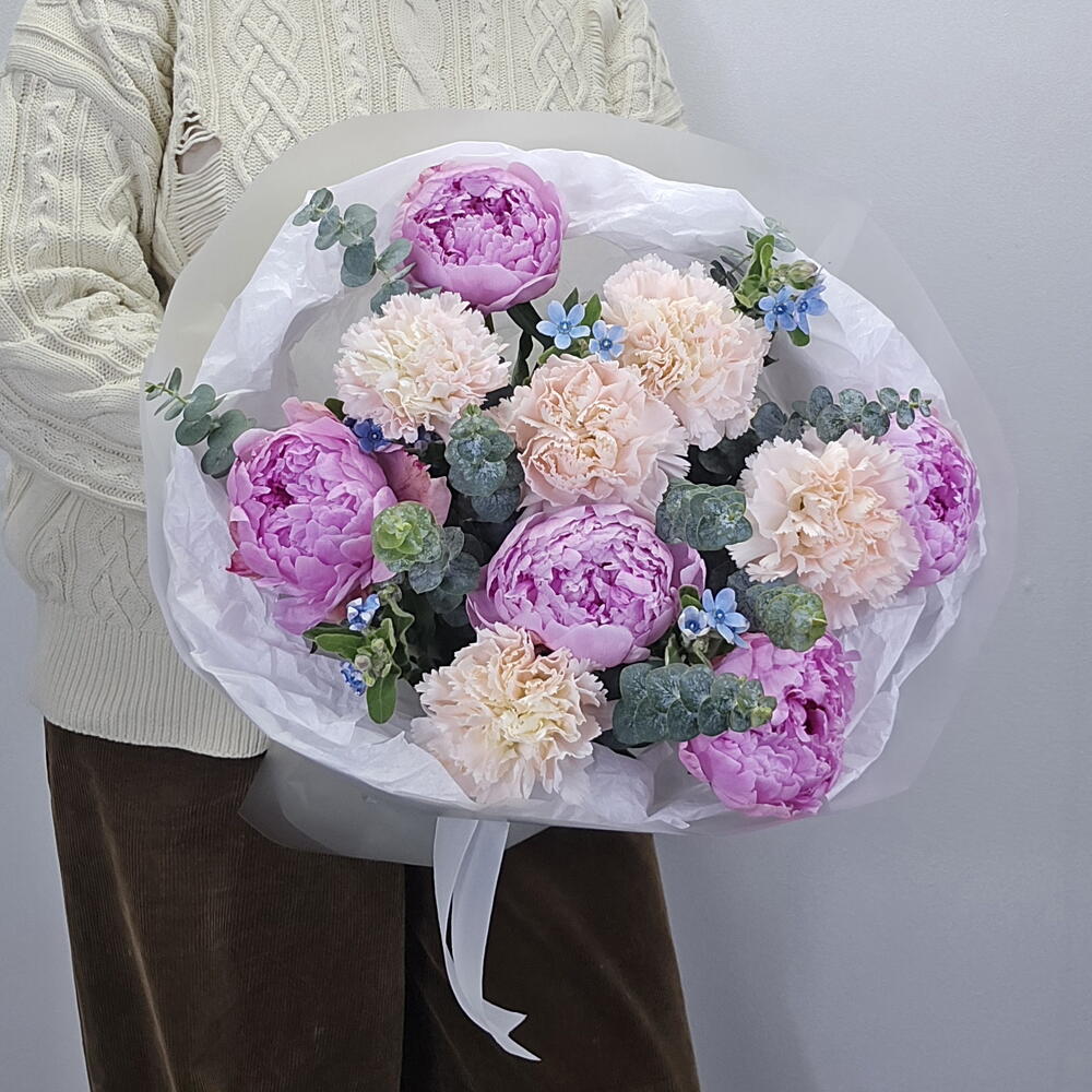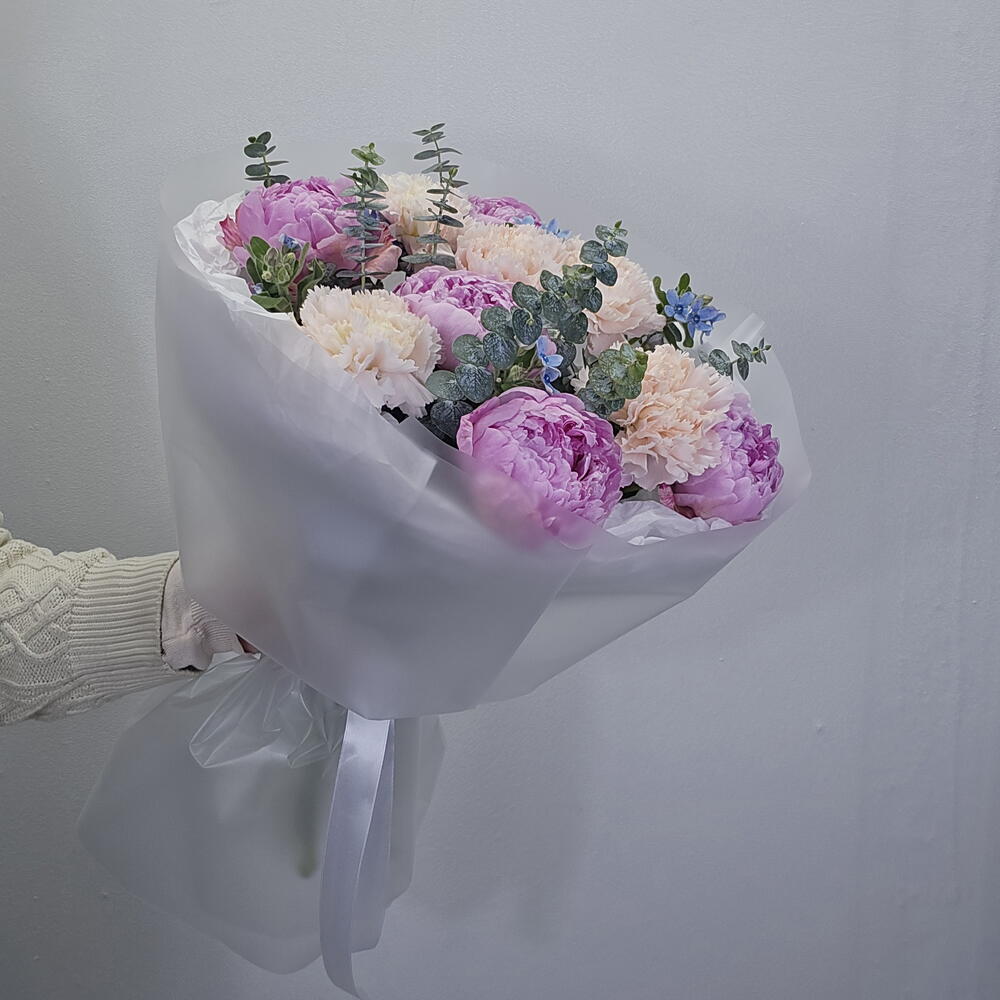 Пион - 5 шт. Лента атласная - 1 шт. Тишью - 2 шт. Диантус - 5 шт. Оксипеталум - 5 шт. Аквабокс - 1 шт. Кризал (подкормка) - 1 шт. Пленка матовая - 3 шт. Эвкалипт Микс - 3 шт. коробка транспортировочная - 1 шт.