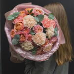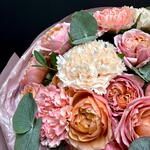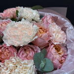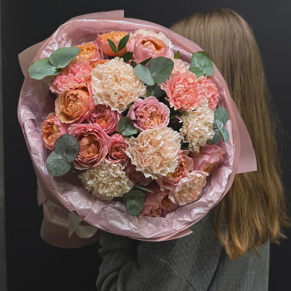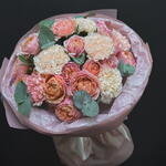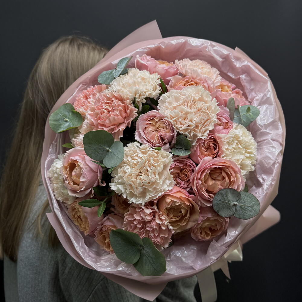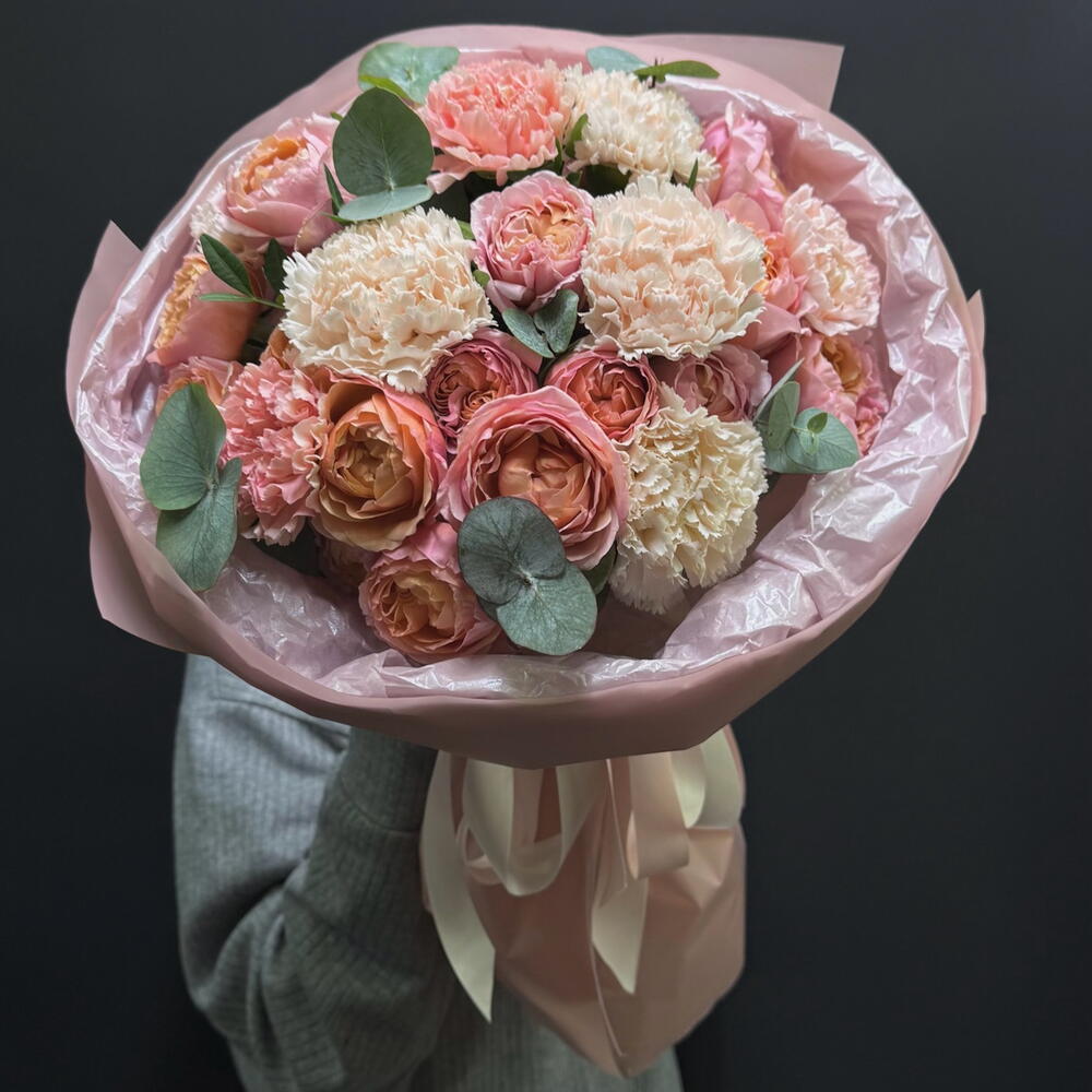 Диантус - 9 шт. Упаковка дизайнерская - 1 шт. Эвкалипт Микс - 1 шт. Роза кустовая пионовидная джульетта - 4 шт.