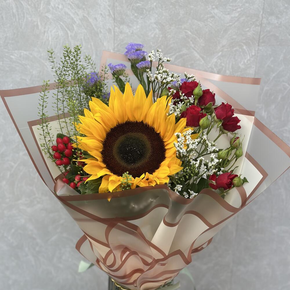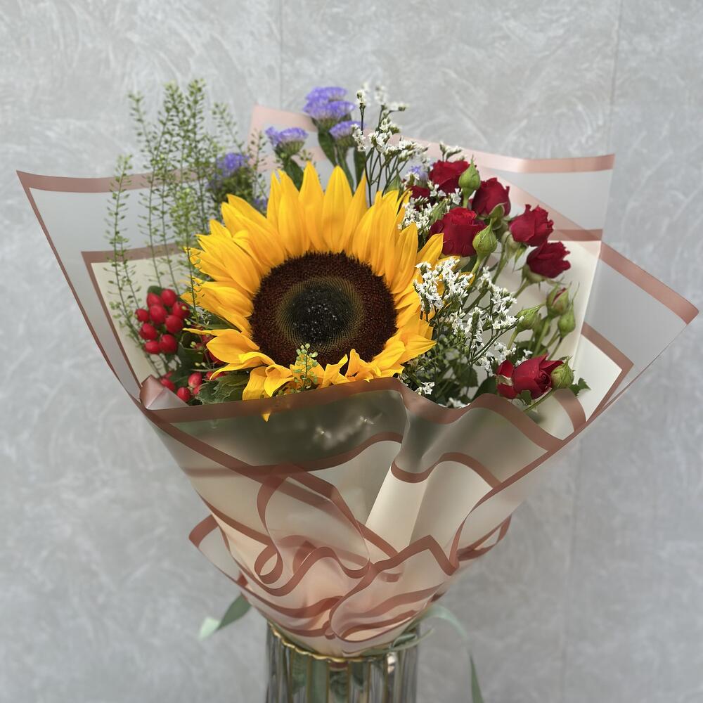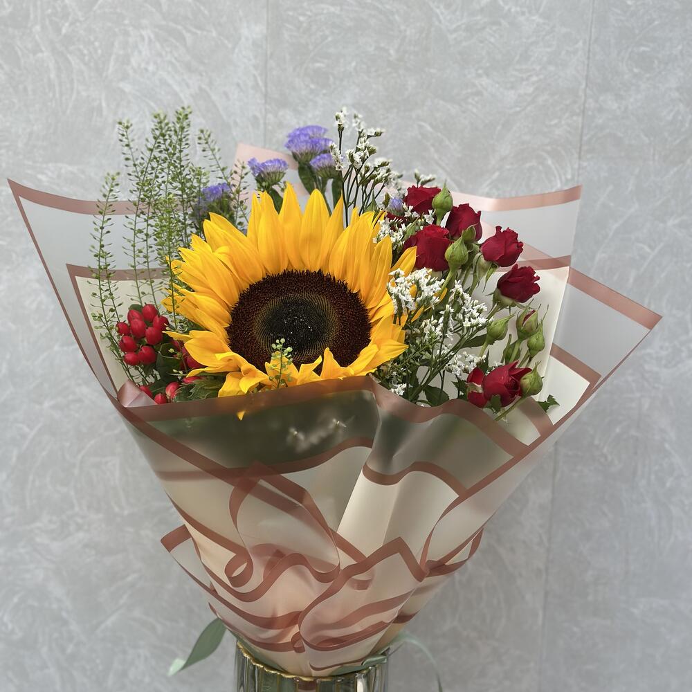 Гиперикум - 1 шт. Лимониум - 1 шт. Статица - 1 шт. Кустовая роза - 1 шт. Подсолнух - 1 шт. Гринбелл - 1 шт. пленка матовая и лента - 3 шт.