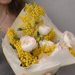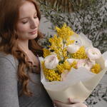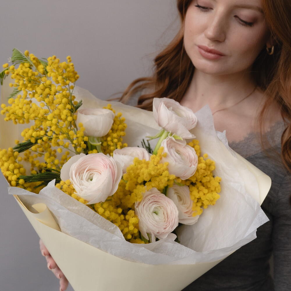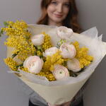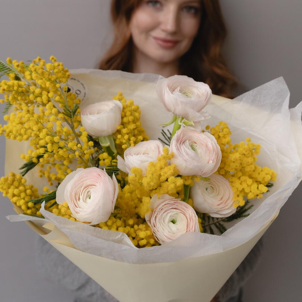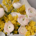 Нежный весенний букет с ранункулюсами и мимозой — тёплый и светлый подарок для мамы, бабушки или близкого человека. Подойдёт на 8 Марта, день рождения или просто как знак внимания. Собирается вручную из свежих сезонных цветов.