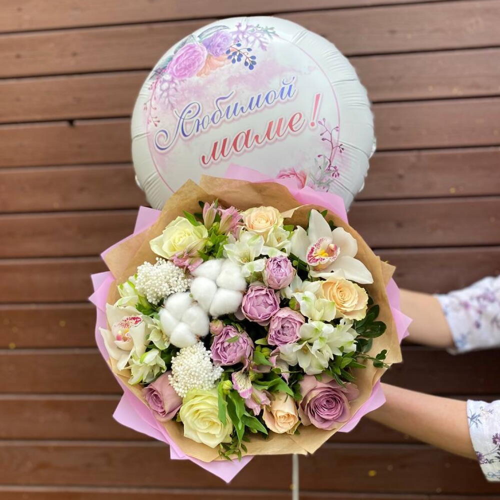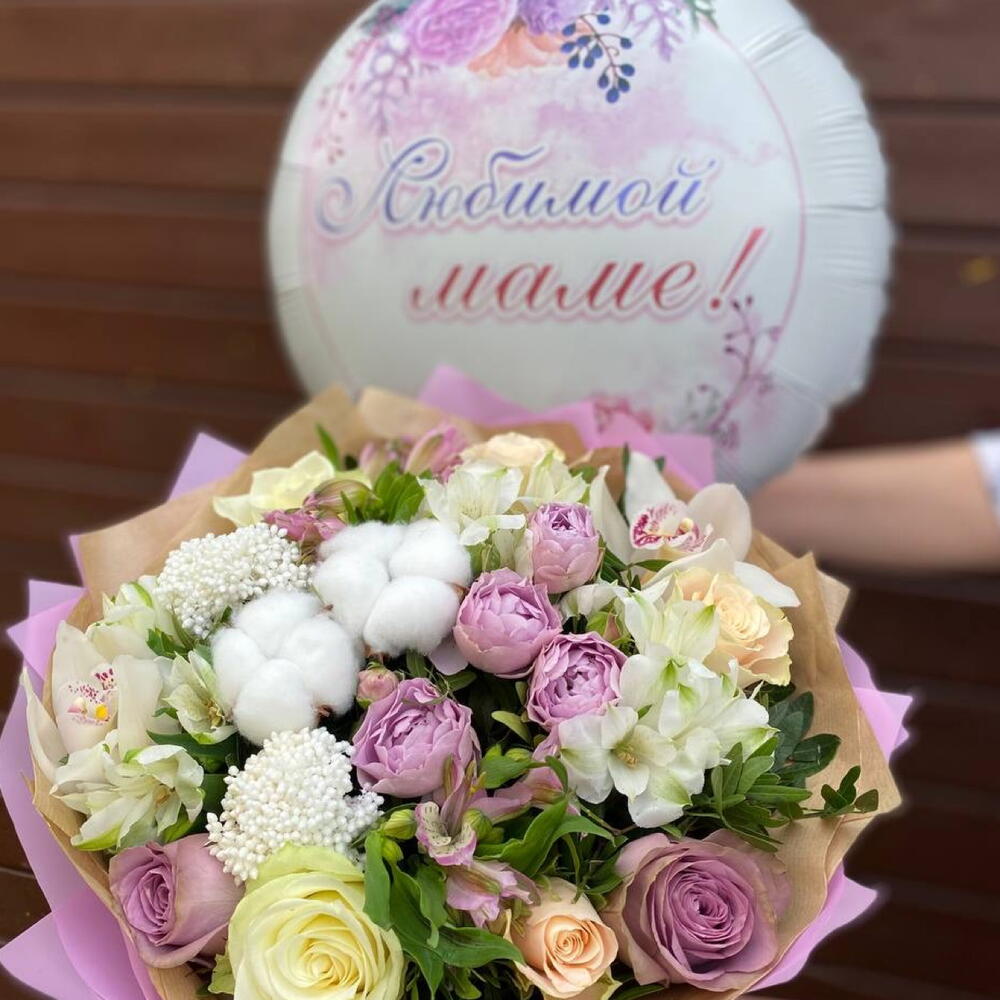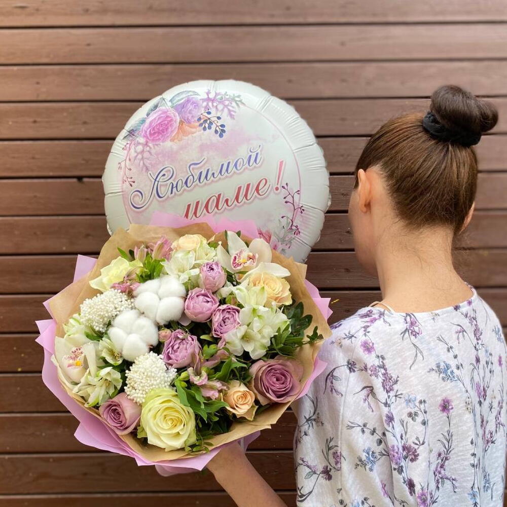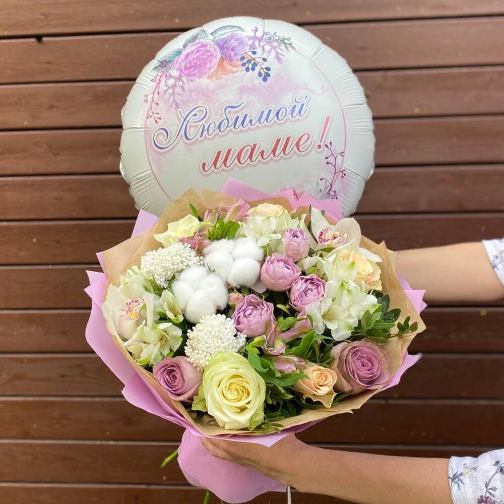 Букет и шарик для мамы - это отличный подарок, который не оставит равнодушным. При желании шарик можно заменить на сердце без надписи, напишите об этом в комментарии.