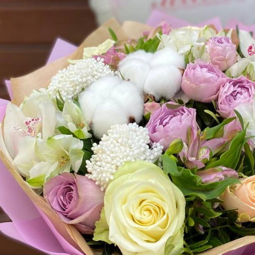 Альстромерия - 5 шт. Озотамнус - 2 шт. Орхидея Цимбидиум - 2 шт. Писташ - 3 шт. Хлопок - 2 шт. Роза - 7 шт. Упаковка дизайнерская - 1 шт. Пионовидная кустовая роза - 1 шт. шарик фольгированный сердце - 1 шт.