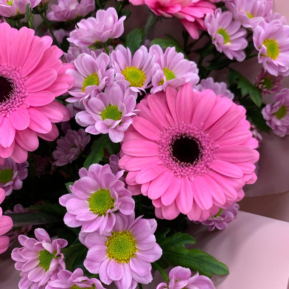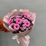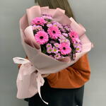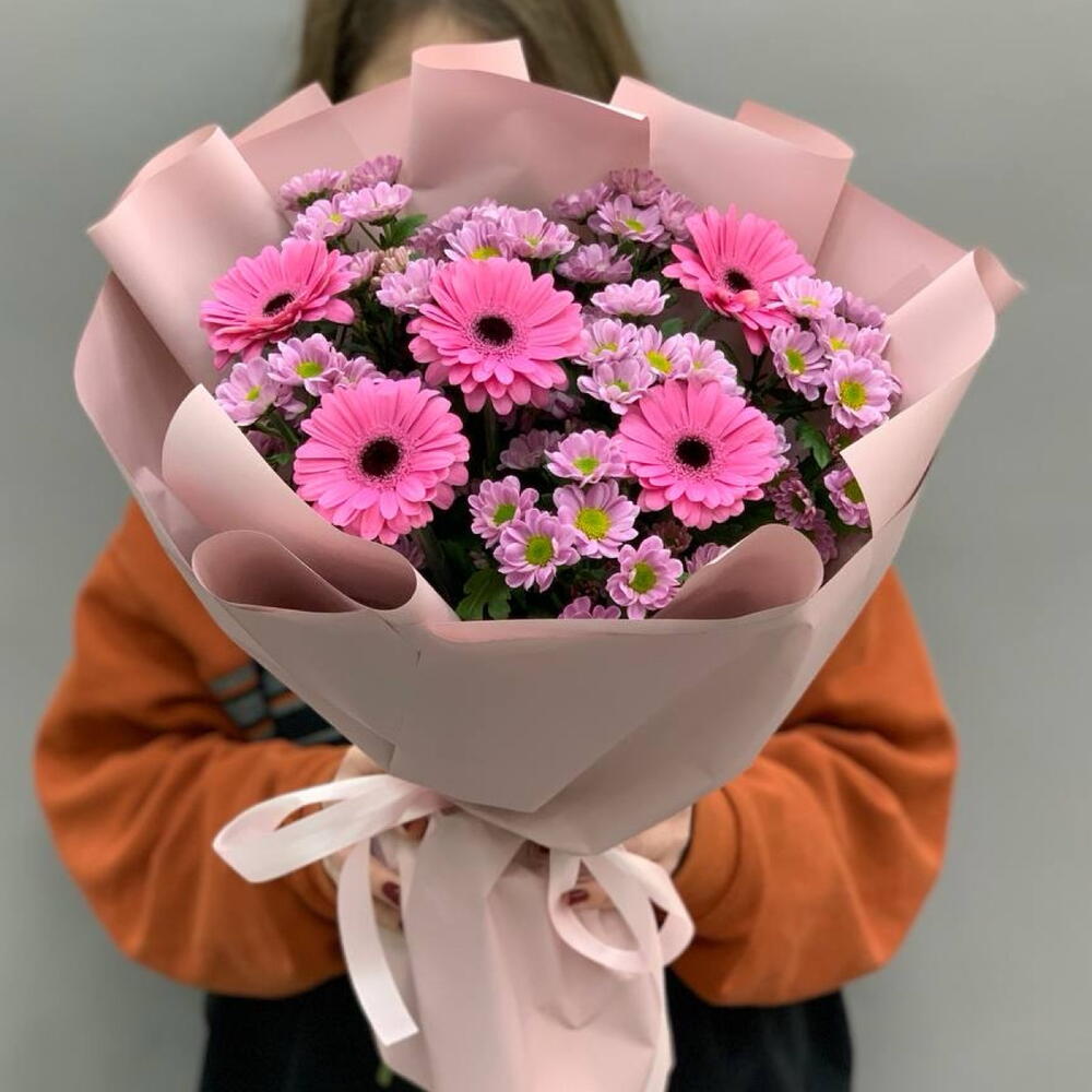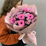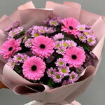 Этот букет соткан из улыбок. Миниатюрные, словно фарфоровые, сантини служат идеальным фоном для озорных ярких гермини — маленьких солнышек с пушистой сердцевиной. Дуэт нежности и игривости выглядит свежо и фактурно. Такой букет дарит тепло, поднимает настроение и говорит о симпатии без лишних слов. Идеальный выбор для тех, кто ценит оригинальность и уютную красоту.