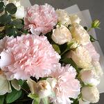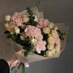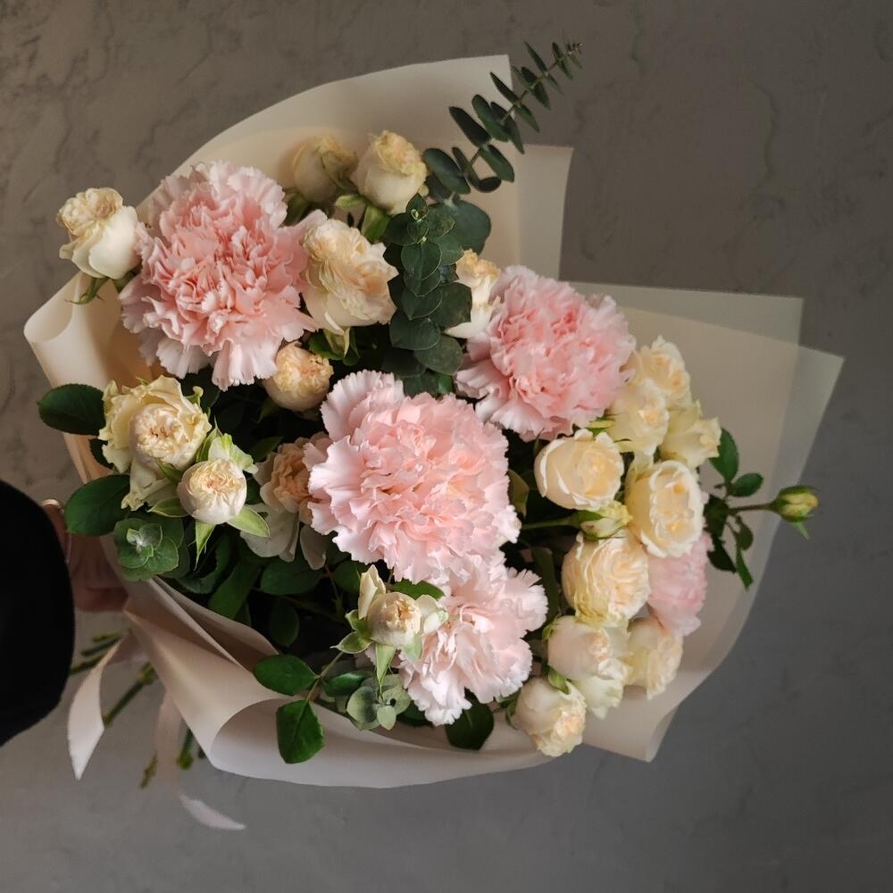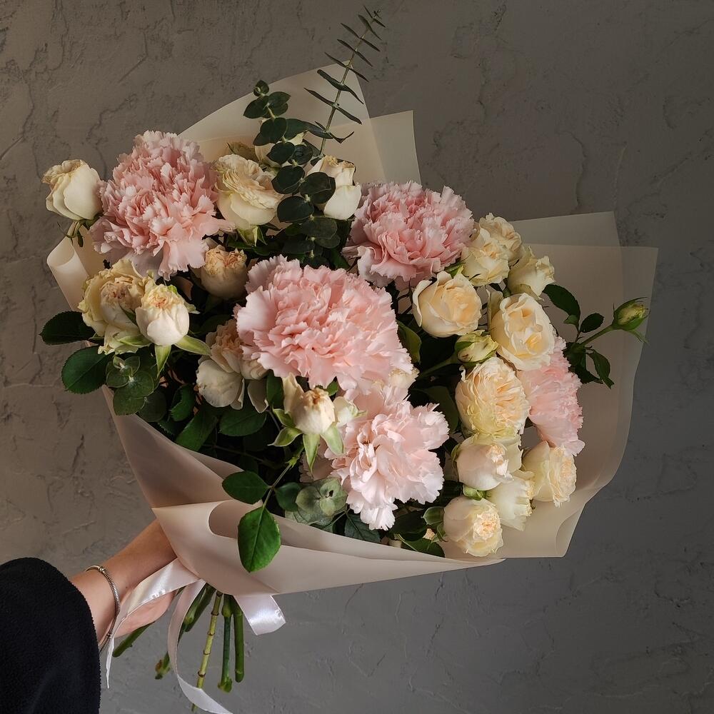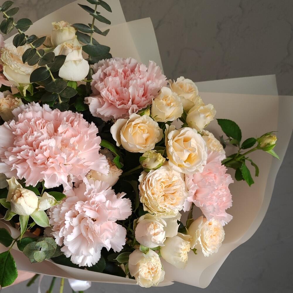 Букет сборный "летний ветер" ( розы кустовая, эвкалипт, диантус гвоздика) для любимой мамы