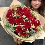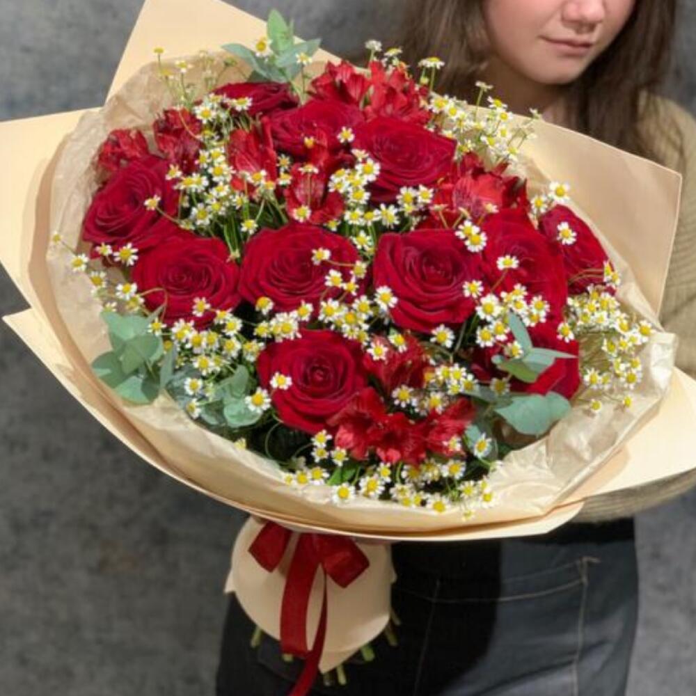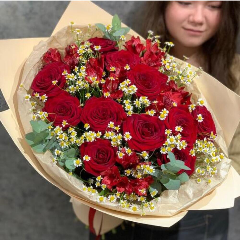 Альстромерия - 3 шт. Роза красная - 11 шт. Эвкалипт - 5 шт. Танацетум камилла - 7 шт. Дизайнерское оформление - 5 шт.