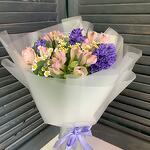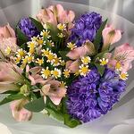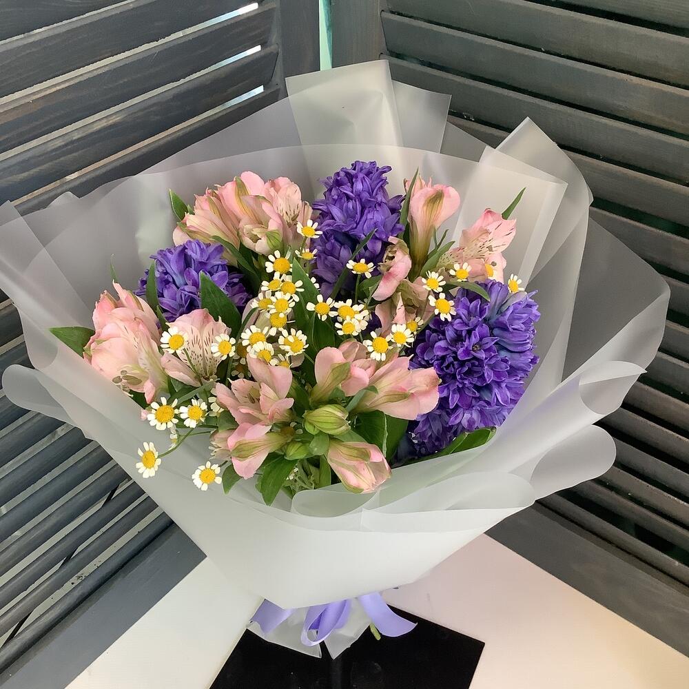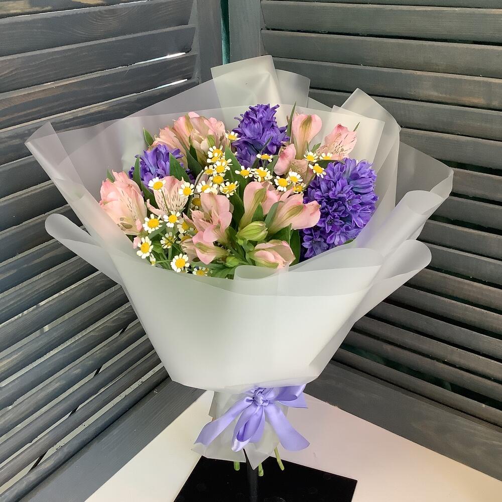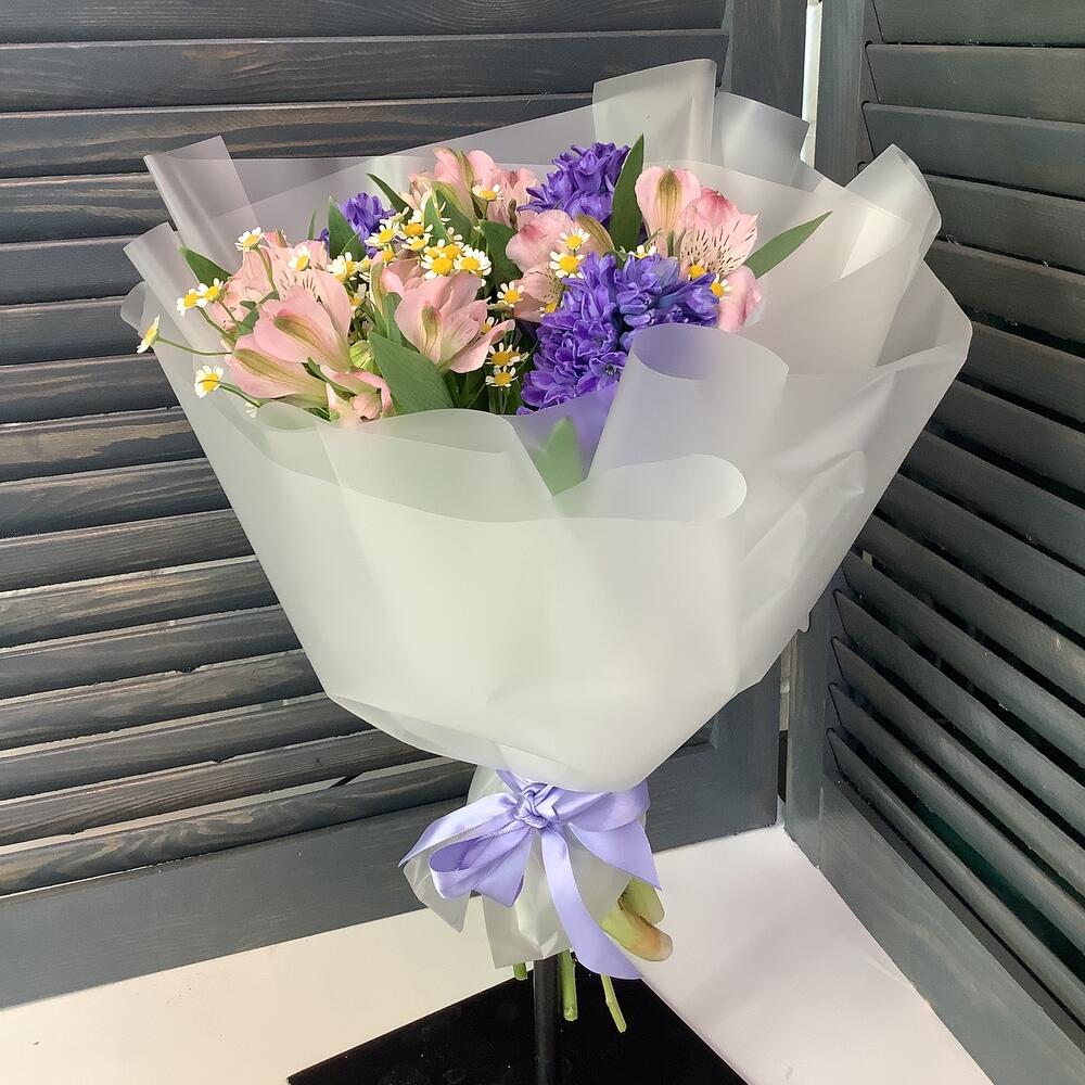 Альстромерия - 4 шт. Гиацинт - 3 шт. Танацетум - 2 шт. Пленка матовая - 2 шт.