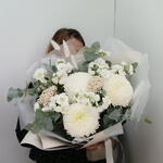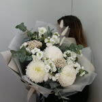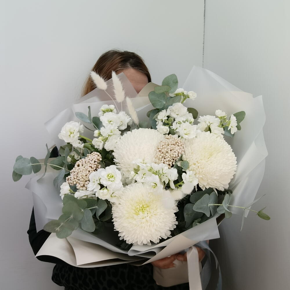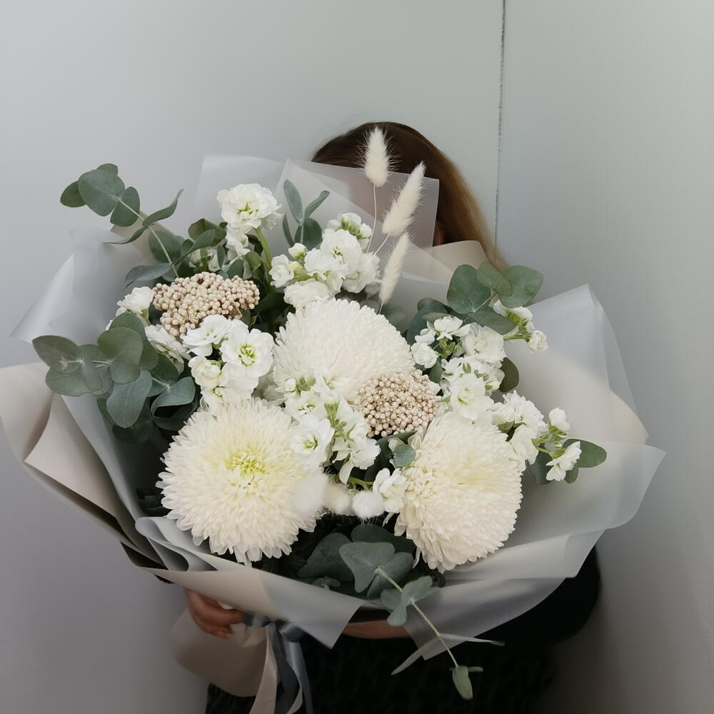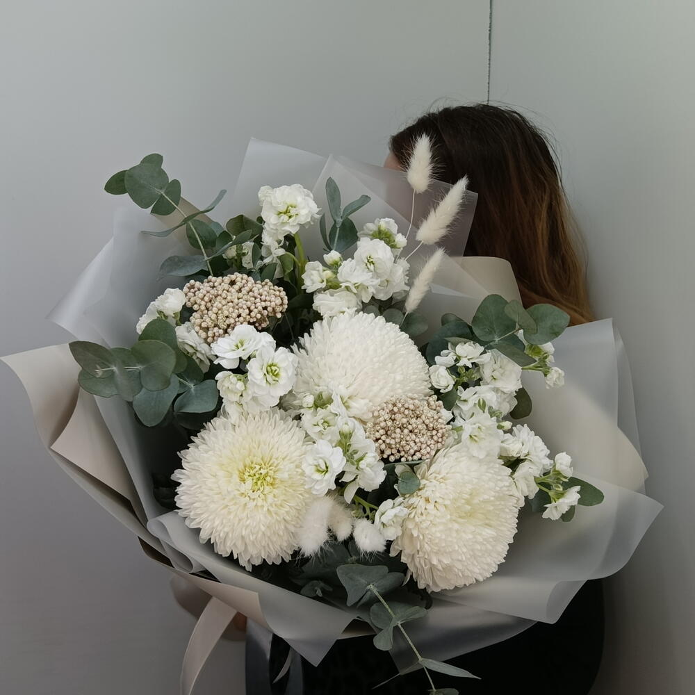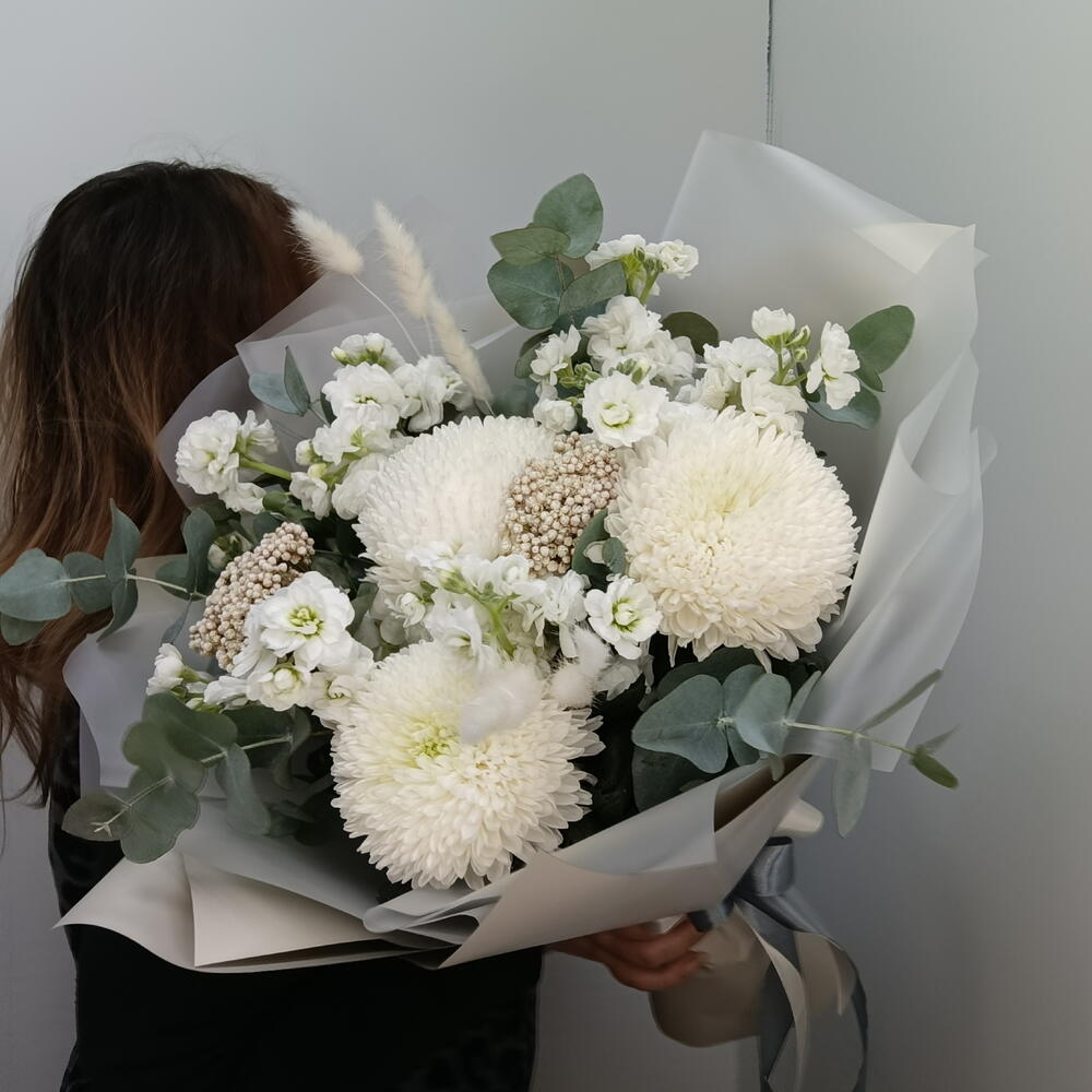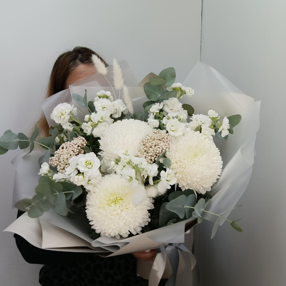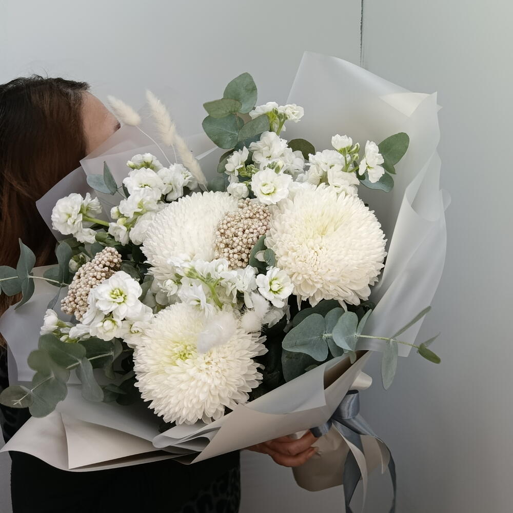 Лента атласная - 2 шт. Хризантема одноголовая - 3 шт. Упаковка дизайнерская - 6 шт. Лагурус - 6 шт. Озотамнус Белый - 2 шт. Эвкалипт Цинерея - 7 шт. маттиола кустовая - 4 шт.
