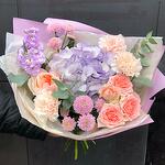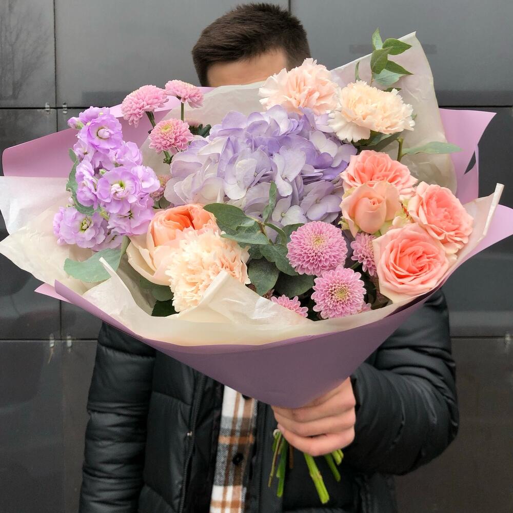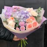 Маттиола - 1 шт. Роза кустовая - 1 шт. Хризантема Сантини - 2 шт. Диантус - 3 шт. Упаковка дизайнерская - 1 шт. Гидрангея - 1 шт. Роза Джульетта - 1 шт. листья фисташки - 2 шт. листья эвкалипта - 1 шт.