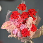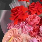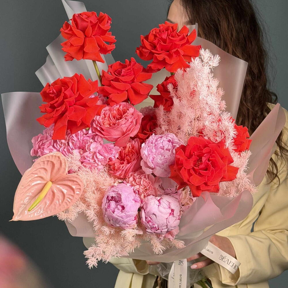 Антуриум - 1 шт. Гвоздика - 5 шт. Пион Сара Бернард - 3 шт. гортензия колумбия - 2 шт. аспарагус стабилизированный - 1 шт. нина роза - 8 шт. кенди экспрешн роза пионовидная - 2 шт.