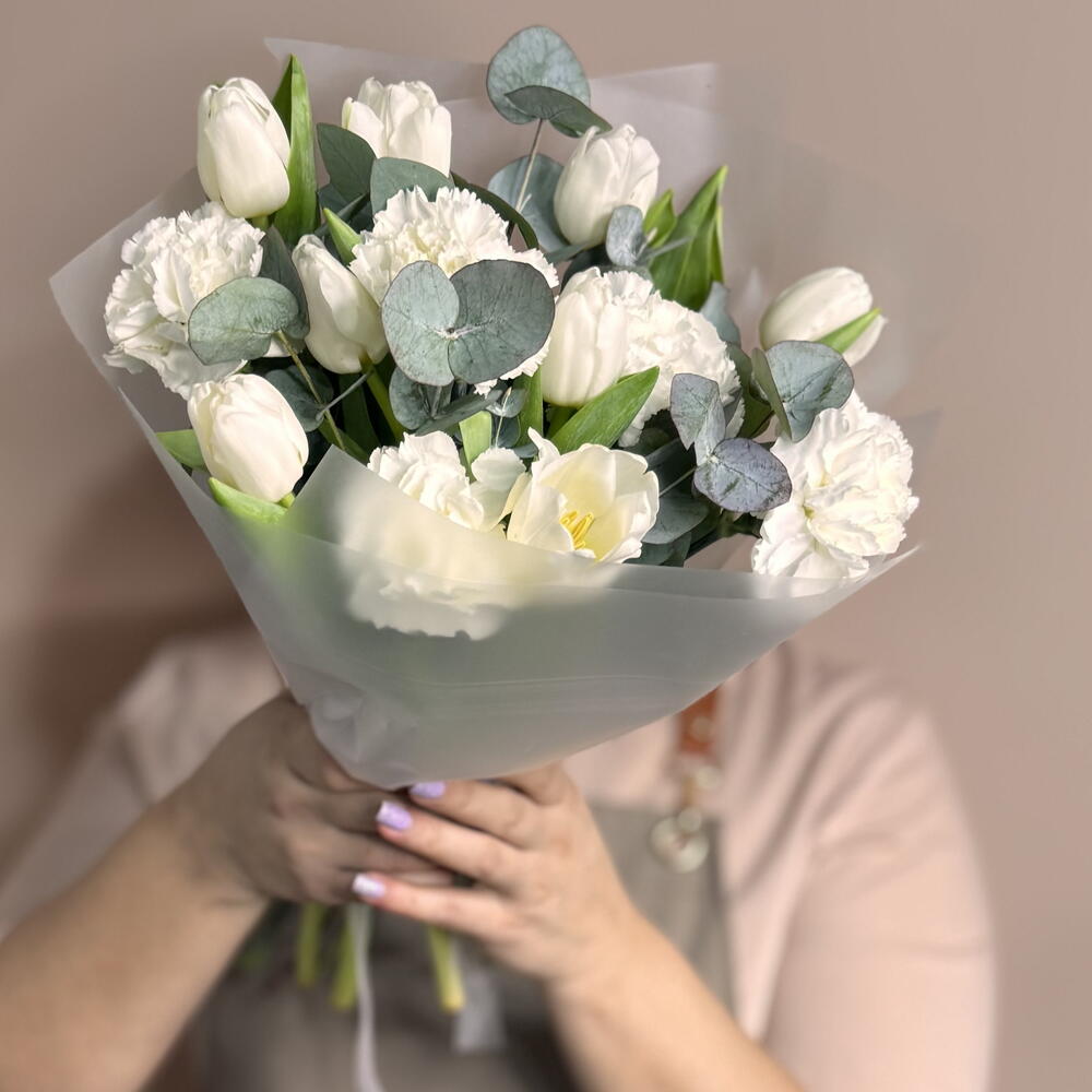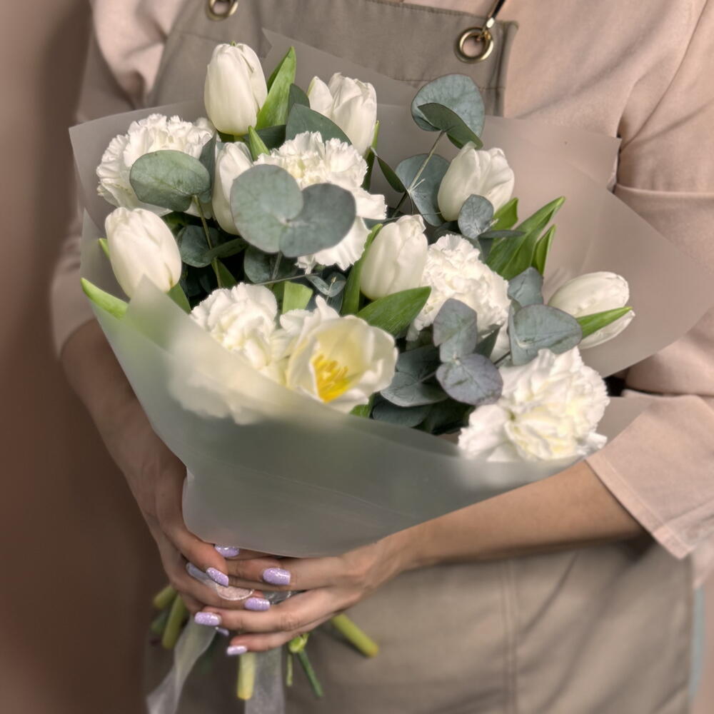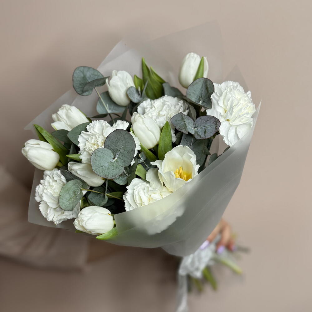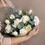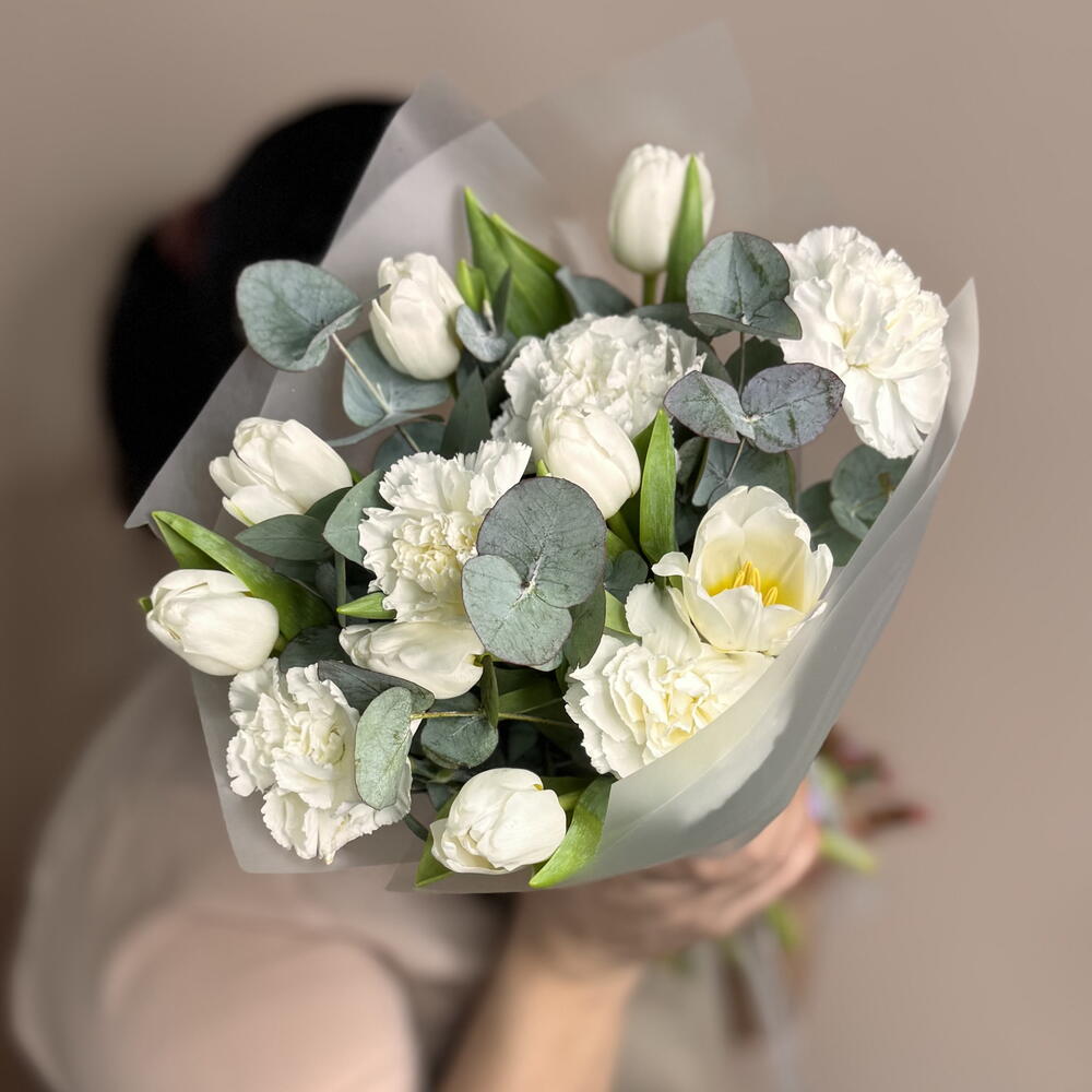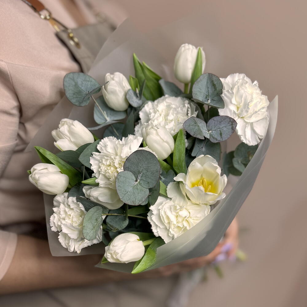 Букет тюльпанов с диантусами и эвкалиптом с 8 марта
